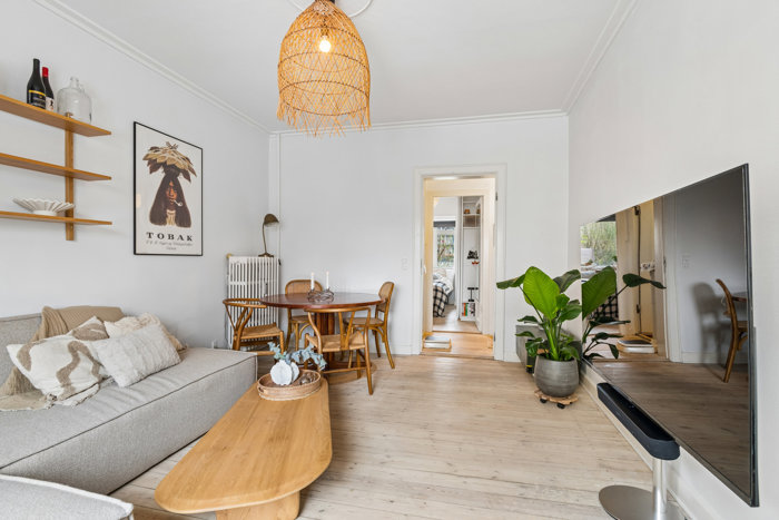 Lejligheden råder over 52 m2, som fordeler sig over en velindrettet planløsning, hvor alle rum tilgås fra entreen, hvilket gør den perfekt som delebolig. Dette understreges blot med de to gode værelser, der, for samboerne, kan agere to separate afdelinger. For parret eller enkeltpersonen vil det derimod være oplagt at indrette en dejlig stue og et godt soveværelse, hvor der er plads til både seng og garderobe. Begge rum er af god størrelse og har et behageligt lysindfald. De to værelser suppleres af et flot brusebadeværelse og et nyere køkken med opvaskemaskine, der opfylder alle tidens trends med hvide grebsfrie elementer og mørke bordplader, der står i flot kontrast til hinanden. Lejligheden er i god stand.
