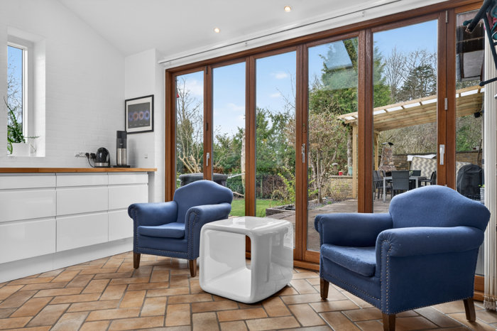 Endnu en bemærkelsesværdig løsning er det store køkken-alrum, der har nye hårde hvidevarer og ligger som en helt særlig afdeling. Det grebsfri skabsinventar er en tidssvarende tilføjelse, mens gulvet er lagt i smukke klinker med vandbåren gulvvarme, der drives af pillefyret. En stor foldedør i hårdttræ leder direkte ud til terrassen, og derudover er afdelingen udført med loft til kip og ovenlys – en helt unik egenskab for boliger som denne. Lige så indbydende er udtrykket i den øvrige bolig, som blandt andet tæller to rummelige stuer i åben forbindelse. Læg dertil et stort soveværelse med walk-in-closet samt et badeværelse af høj kvalitet.