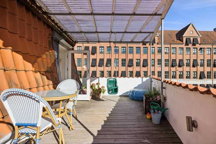 Lejligheden placerer sig på første sal i ejendommen, der er opført i 1934, så I får glæde af at være hævet lidt fra gadeplan. Fra boligens nederste etage er der direkte adgang til en skøn, overdækket terrasse, der er ideel til hyggelige middage og afslapning i behagelige omgivelser. Samtidig træder I oppe på anden sal ud til en vestvendt altan, hvor der også kan indrettes et par siddepladser.