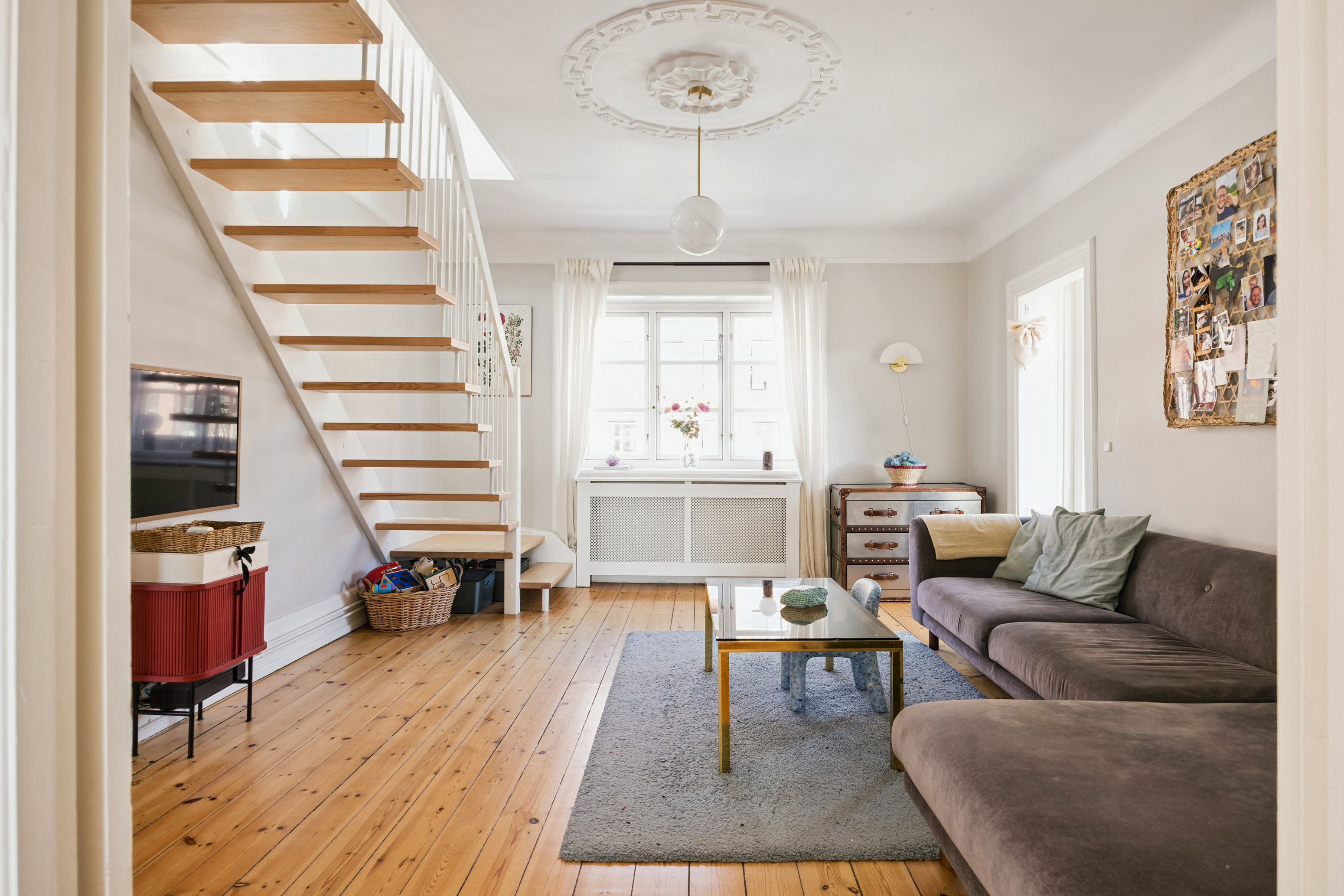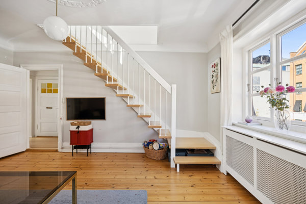 Hjemmet byder på smukke, tidløse elementer som fyldningsdøre, elegante franske døre mellem to stuer en suite, klassiske gulve og flot stukkatur, der tilfører hjemmet stemning og en herskabelig karakter. Et nydeligt køkken blender naturligt ind i indretningen, og planløsningen består ligeledes af et badeværelse med separat brus samt et stort soveværelse med skabsplads i boligens nedre plan. Øverst i lejligheden, og i ejendommen, er der et kæmpe værelse/alrum, som kan indrettes til mange formål.