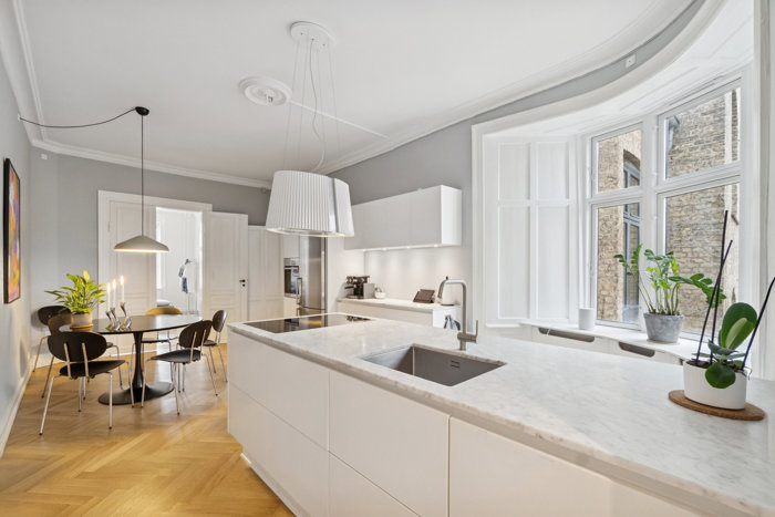 Det åbne køkken har halv kogeø, og der er valgt et enkelt, hvidt design med en massiv Carrara marmorbordplade. Takket være de fine rumforløb er der fra køkkenet langt kig gennem lejligheden til to ud af de tre værelser.