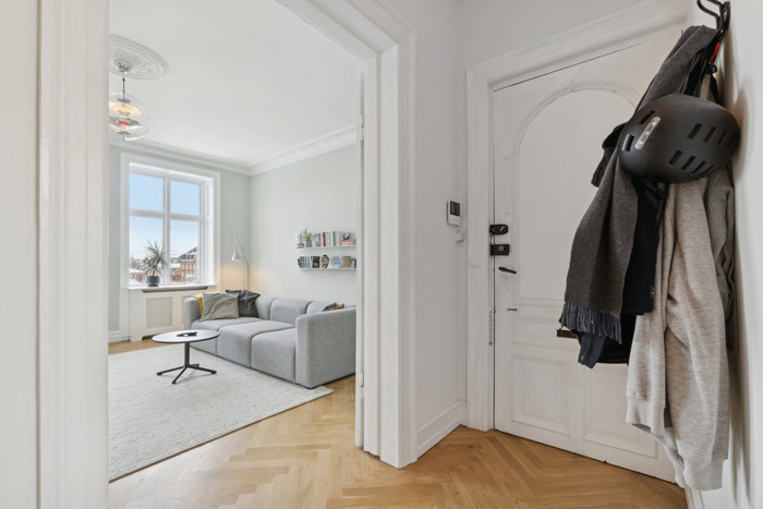 Ejendommen kan dateres tilbage til 1888, og den prydes af elegante facade udsmykninger. Byggeriets klassiske udtryk spejler sig også i opgangen – og selv hoveddøren til lejligheden er et lille kunststykke. Indenfor kendetegnes indretningen af en diskret farvepalet og smagfuldt inventar, som komplimenterer det flotte sildebensparket. Flere af boligens rum har stuk og loftrosetter, og værd at fremhæve er tillige de hvide fløjdøre og spisekøkkenets buede karnap.