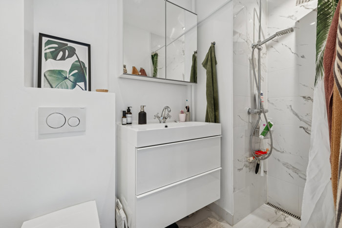 Man træder ind i en entre, hvor der er massere af muligheder for at aflægge fod- og overtøj. Ved første øjekast, bliver man mødt af det utrolig smukke gulv, som er i rigtig god stand. Første dør til venstre møder man et mindre værelse, som enten kan bruges som børneværelse eller kontor. Går man videre i gangen kommer man ind i stuen, som er meget rummelig, fra stuen har man direkte adgang til den store syd/vestvendte altan. Går man videre i gangen kommer der et virkelig smukt og lyst badeværelse, med hvidelignende marmor fliser som er i rigtig god stand, og er veludnyttet. I slutningen af gangen til venstre har man det store master bedroom, hvor man har massere skabsplads og er rummeligt. Køkkenet er beliggende til sidst i gangen, og der har man alt hvad der er nødvendigt, inklusiv vaskemaskine med tørretumbler. Her får du altså en indflytningsklar og veldisponeret lejlighed i rigtig god stand.