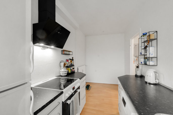 I entréen er der integreret garderobe, og netop fra entréen tilgår du boligens væsentlige rum. Ret fremme finder du et pænt køkken med lyst skabsinventar og mørke bordplader. Der er både opvaskemaskine og vaskemaskine, og hvis du vil, kan du etablere et lille spisehjørne ved bagvæggen. Til venstre for entréen ligger badeværelset, som er meget reelt og ligeledes udført med lyst inventar, mens den store stue udgør det egentlige opholdsrum på højre hånd. Her finder du også lejlighedens soveværelse, inden turen går til den lukkede altan, hvor vinduerne kan åbnes eller lukkes alt efter årstiden.