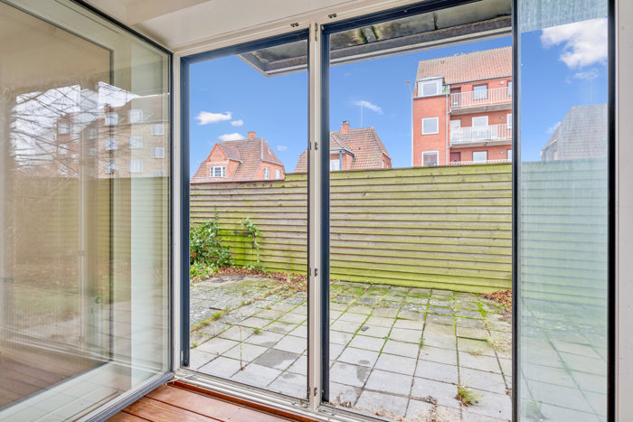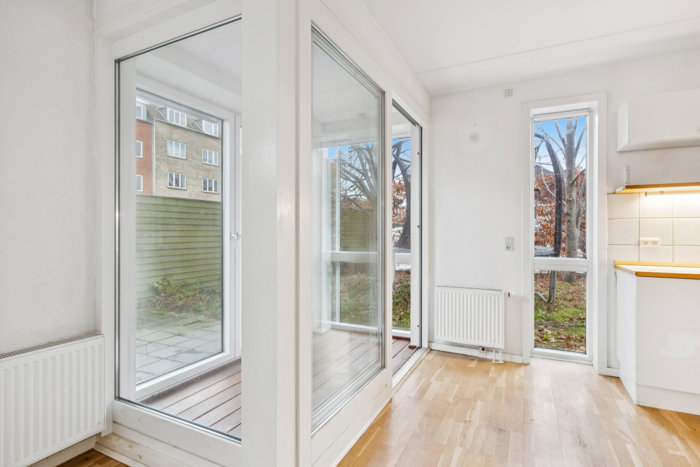 Stor skøn stue i åben forbindelse med hvidt elementkøkken. Fra stuen er der 2 udgange til skøn terrasse. Stuen kan let opdeles så man får et ekstra værelse. Køkkenet har et klassisk udtryk og er fint placeret i hjørnet, så pladsen er udnyttet optimalt. Lyset strømmer ind fra syd og vest, hvilket gør noget forrygende for rumfornemmelsen. Til slut skal du se badeværelset, der kommer med separat bruseniche og kombineret Tørre/vaskemaskine. Der er eget direkte indgang til boligen.