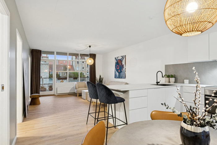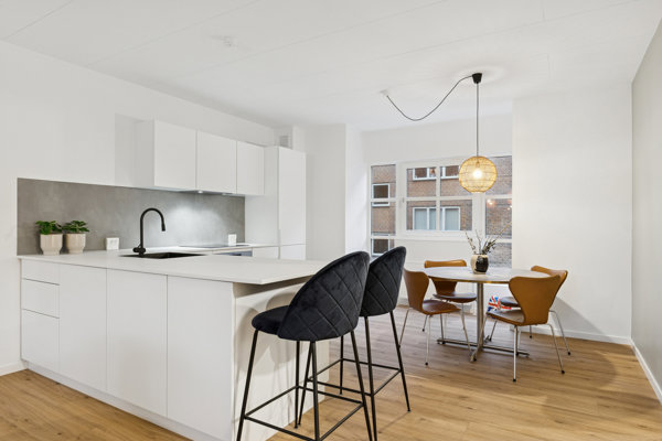 Allerede når du træder ind i lejligheden, mærker du, at her er der tænkt over både rum og sammenhæng. Entréen ligger centralt og giver en naturlig fordeling til boligens rum – uden spildplads og uden at noget føles klemt.