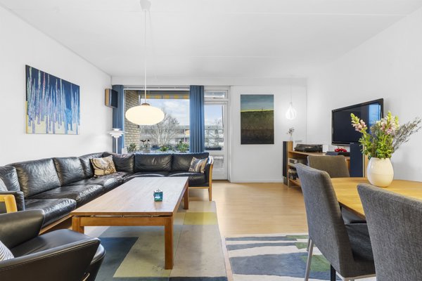 Fra fordelingsgangen er der adgang til et flot køkken med god skabs- og arbejdsplads og den lyse og rummelige stue og spisestue, har direkte udgang til den vestvendte altan, hvor eftermiddags- og aftensolen kan nydes i rolige omgivelser. Her er store vinduespartier og godt lysindfald.