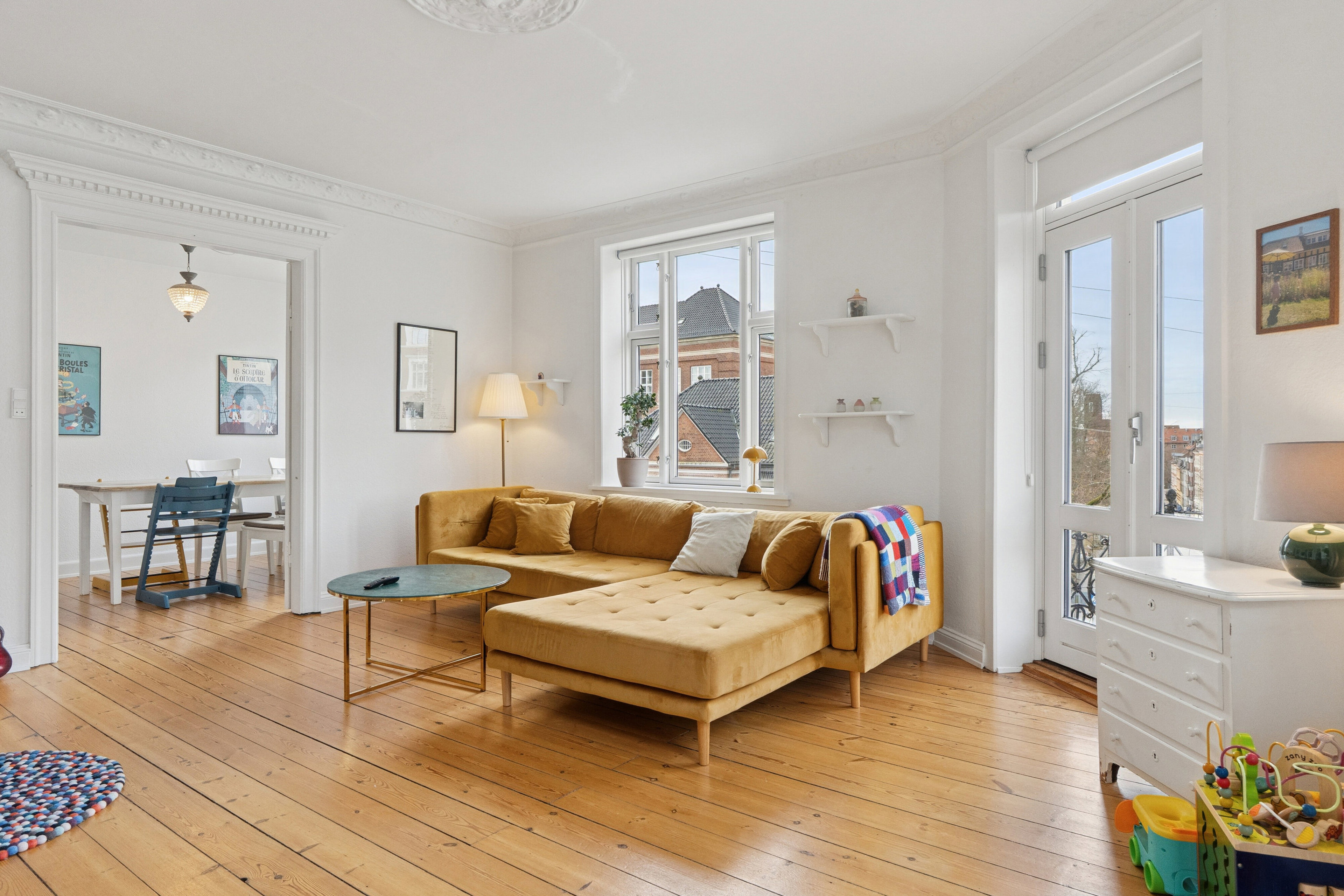 Den rummelige stue imponerer med et flot lysindfald og direkte udgang til altan, hvor byens liv kan nydes. I forlængelse heraf ligger den hyggelige spisestue, som naturligt forbinder opholdsrummene og giver god plads til både hverdag og samvær.
