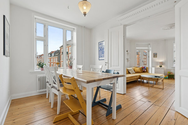 Boligen fremstår lys, moderne og indflytningsklar med en skøn kombination af klassisk herskabelig charme og nutidig stil. De charmerende gulve, høje lofter og smukke stukdetaljer skaber en elegant rød tråd gennem lejligheden og giver en særlig atmosfære, som løfter helhedsindtrykket og gør boligen både indbydende og eksklusiv.