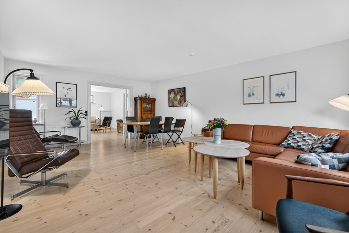 En gennemgående let stemning med et fremragende lysindfald kendetegner boligen, og de store vinduer sætter udsigten flot i scene. Man skiftede installationer i forbindelse med renoveringen, hvor lofter og gulve ligeledes blev skiftet. De massive trægulve passer godt til lejlighedens atmosfære, og det øvrige inventar er lyst og tidløst, så eventuelle opdateringer ikke behøver at ligge i kortene som det første.