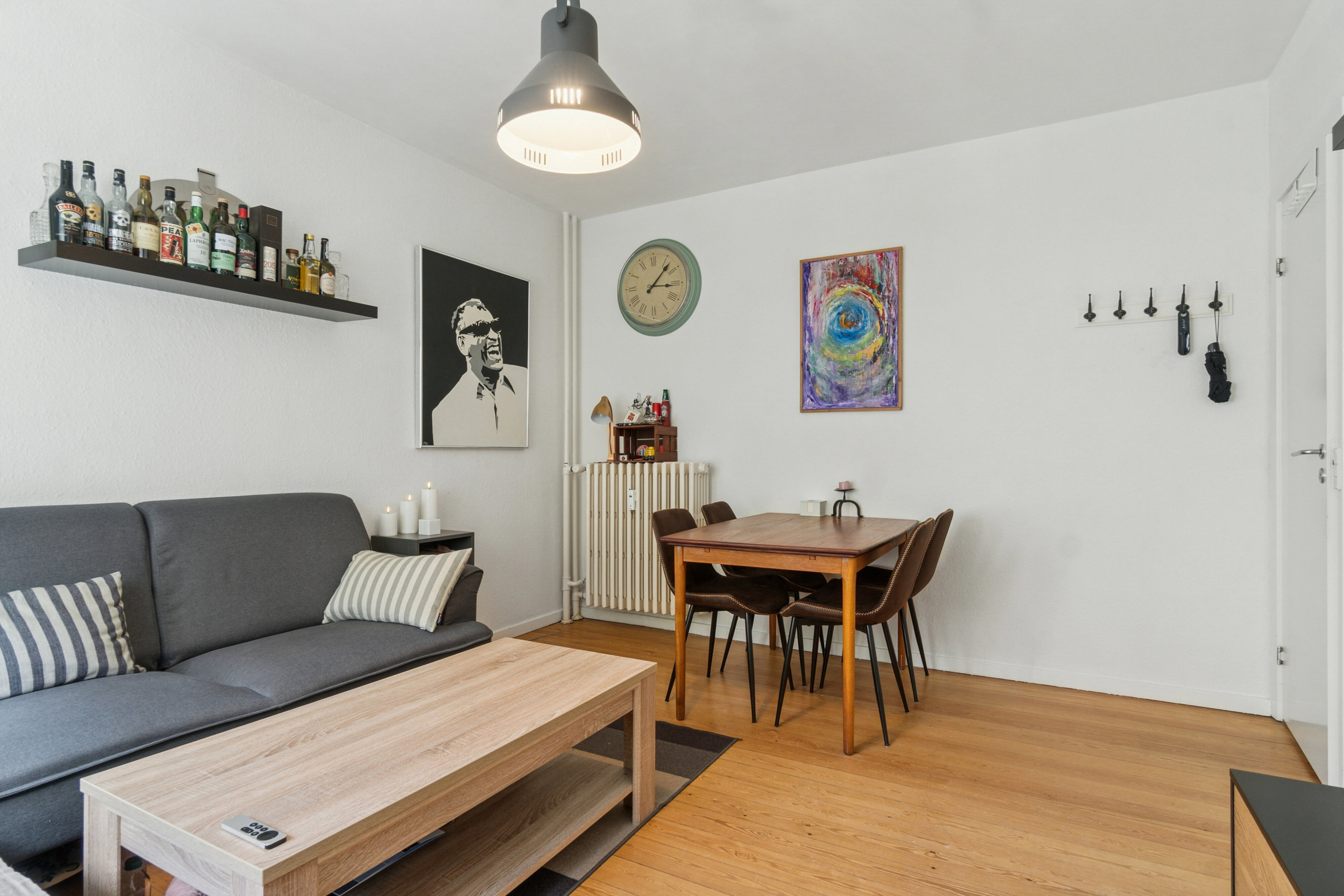 Du bydes velkommen i lejlighedens rummelige fordelingsgang. Her bliver man mødt er den ældre charme med de flotte fyrtræsplanker, som er gennemgående i både gang, stue og værelse. Herfra er der adgang til alle lejlighedens rum, hvorfor denne lejlighed også kan deles af to.
