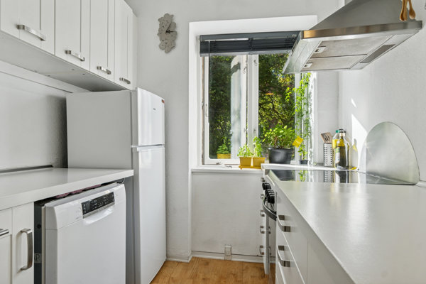 Lejlighedens køkken rummer en god plads med køle- fryseskab, ovn samt opvaskemaskine, og fremstår moderne i lyse materialer.