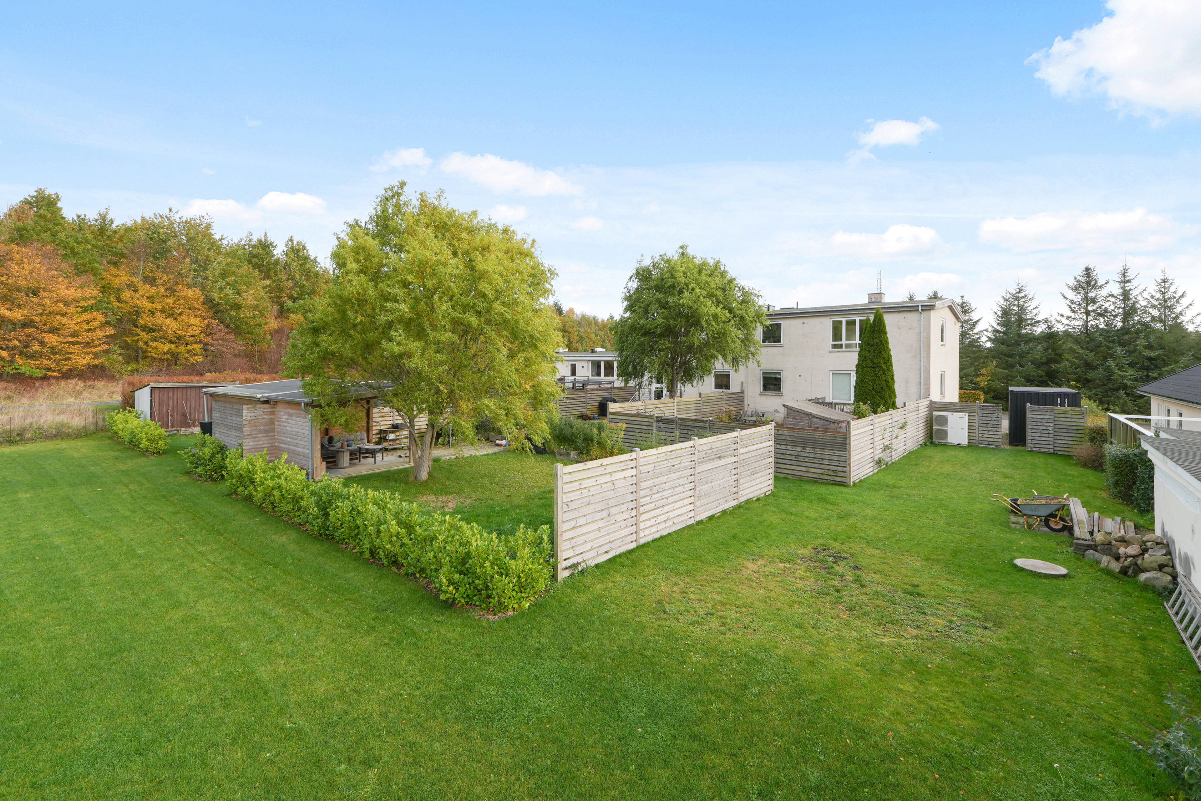 På papiret er lejligheden en ret unik bolig, og det er den heldigvis også i praksis. Den lille bebyggelse tæller ganske få enheder, så ingen i ejerforeningen er fremmede for hinanden. I stedet får I flinke, imødekommende naboer, og foreningens praktiske gøremål klares i al mindelighed. Hvad de færreste ejerlejligheder derudover kan præstere, er den skønne, private have, som bestemt også fortjener at blive fremhævet. Her kan I bare tage plads på den overdækkede terrasse, tænde op i bålfadet og nyde den skønne udsigt over de grønne fællesarealer og bagvedliggende marker.