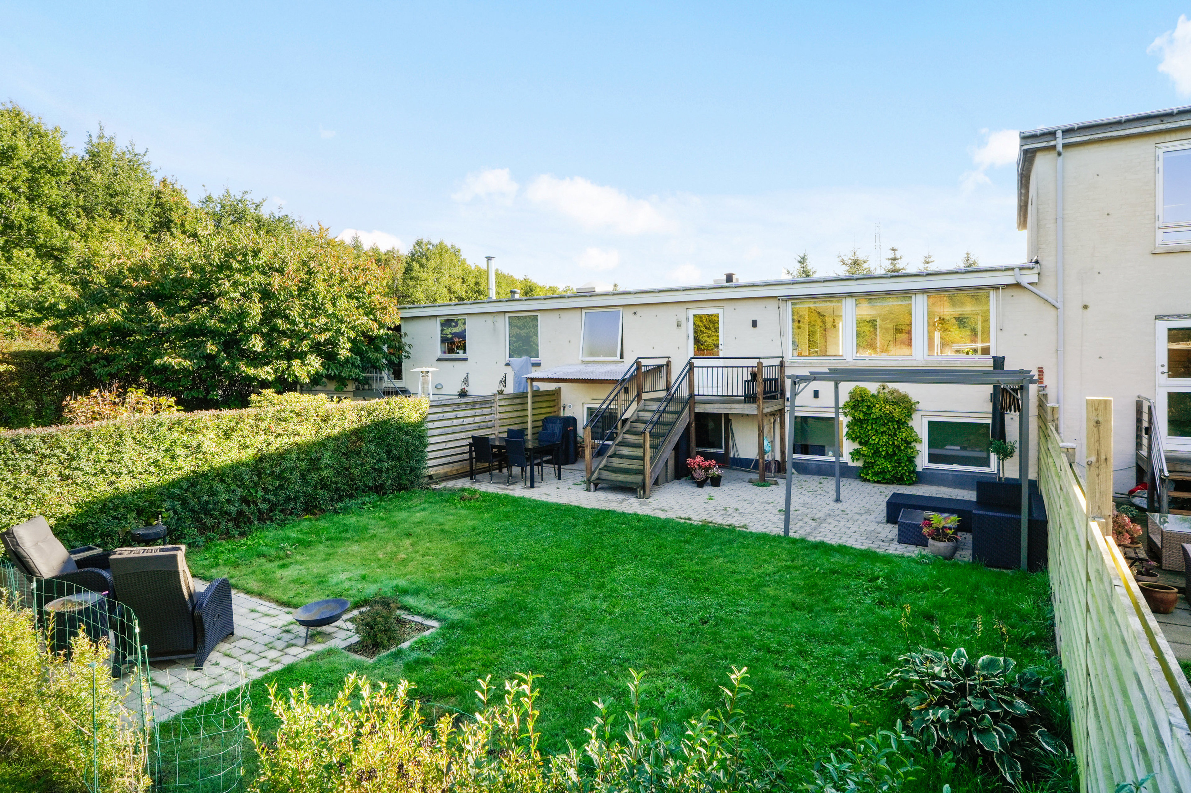 Haven er anlagt på vestsiden af ejendommen, hvor solen er fast gæst hver eneste eftermiddag. Faktisk dukker den allerede op i løbet af formiddagen, og man har anlagt en lille terrasse i det hjørne, hvor den lander først. Læg dertil en større fliseterrasse ved selve boligen, og det lille stykke plæne bliver en overkommelig opgave.