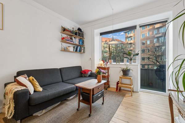Det er en klassisk rødstensejendom fra 1938, som du bosætter dig i. Boligen putter sig på første sal, så der er ikke mange trappetrin op til hoveddøren, når dagen går på hæld. Fra altanen får du morgensol og udsigt til det grønne gårdmiljø nedenfor: et lille, aflukket åndehul midt i byen, hvor sommerdagene får selskab af grøn beplantning, bord-bænke-sæt og sandkasse til de mindste. Her kan du ligeledes parkere cyklen trygt.