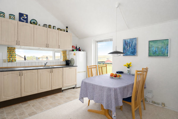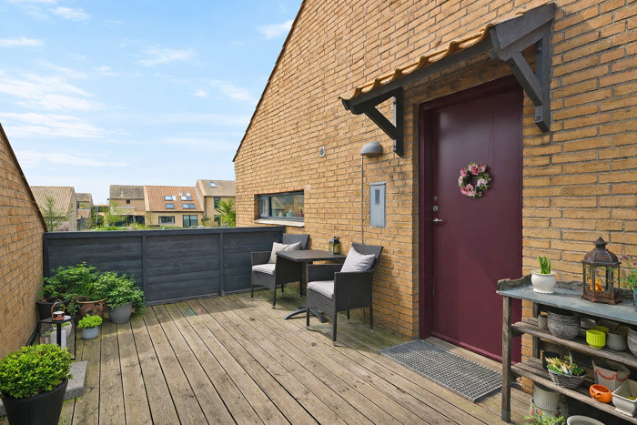 Lejligheden ligger på 1. sal og du ankommer via udvendig trappe til din egen uforstyrrede oase af en solrig terrasse med plads til havemøbler, blomsterkrukker mm.
