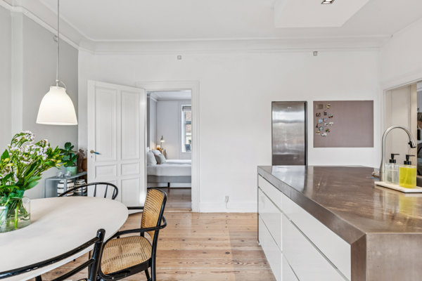 Det ene af værelserne kan deles op, så der etableres yderligere et børneværelse, mens det er i køkken-alrummet, at familien skal samles om middage og filmaftener overfor det moderne køkken, der er indrettet med bl.a. køkkenø, opvaskemaskine og vaskemaskine. Det er ligeså fra alrummet, at I har adgang til en stor, sydvendt altan, der vender mod Frederiksberg Have og et hyggeligt gårdmiljø pakket ind i grønt.