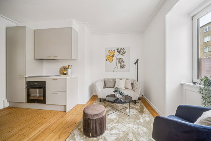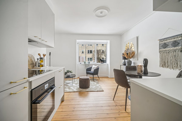 Du får hjemme i en høj stueetage, hvor kvadratmeterne er godt udnyttede. En fin fordelingsentré åbner op til hjemmet og giver på højre hånd afsæt til et pænt soveværelse, mens der på venstre hånd åbnes op til et indbydende køkken-alrum. Under fødderne løber originale plankegulve, mens hjemmet ellers fremstår gennemgående istandsat. Blandt andet med et lækkert nyt designakøkken med nye hårde hvidevarer, der er dækket af garanti, samt et strømlinet nyt badeværelse med væghængt toilet.