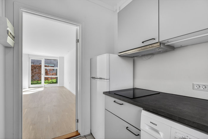 Boligen er en veldisponeret étværelses lejlighed, som i praksis fungerer som en lille toværelses med et separat soveafsnit i forlængelse af stuen. Planløsningen udnytter kvadratmeterne optimalt, så der både er plads til seng, opbevaring samt en hyggelig stue med sofa- og spiseplads. De store vinduespartier sikrer et dejligt lysindfald og skaber en lys og indbydende atmosfære.