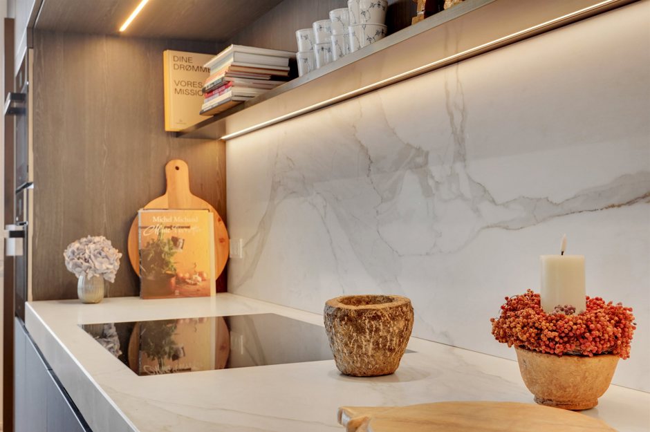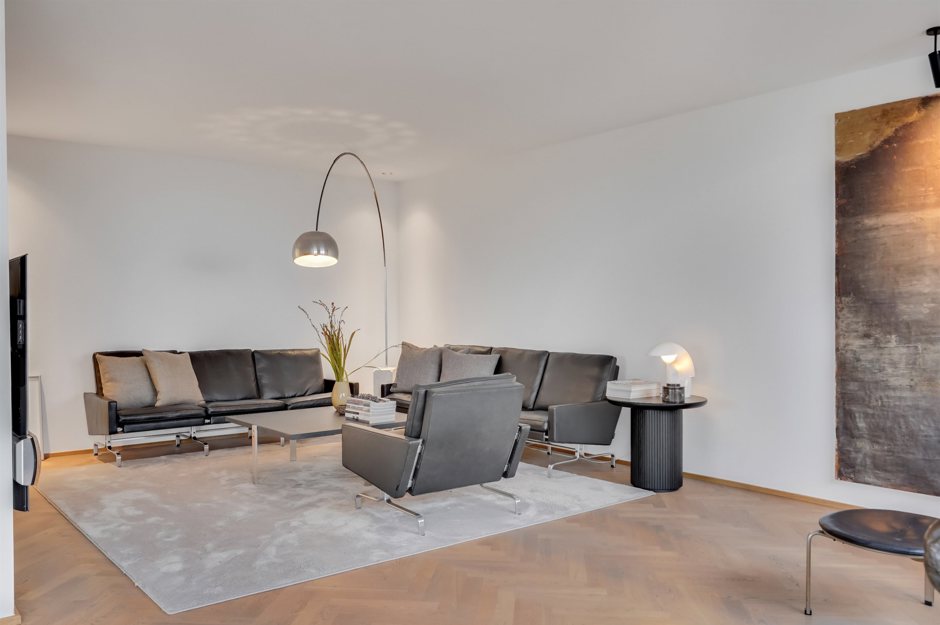 Lejlighedens indretning er både praktisk og stilfuld: