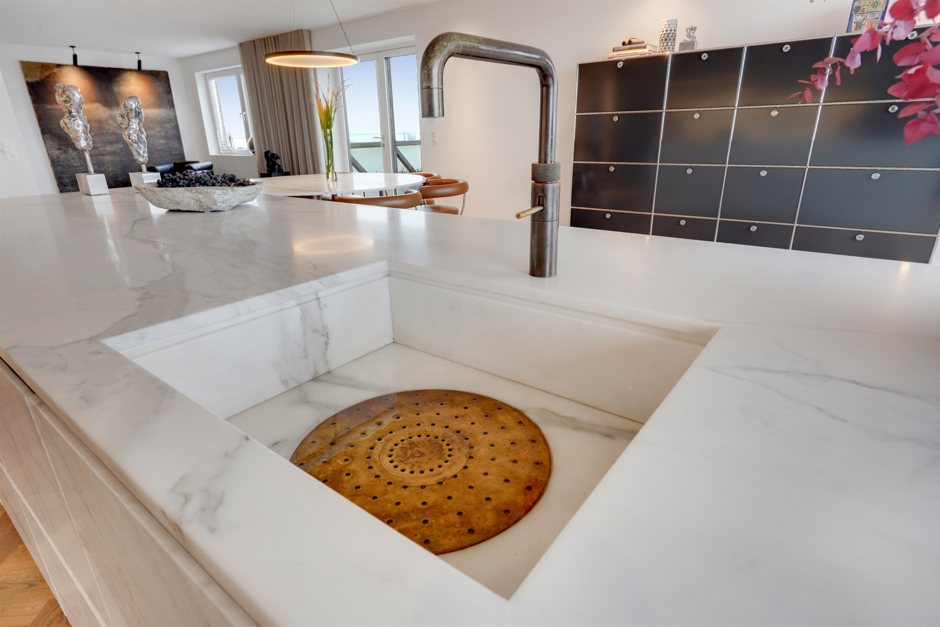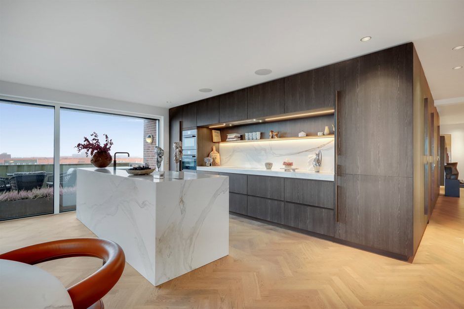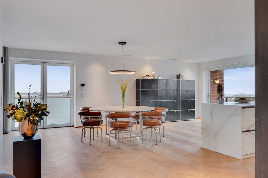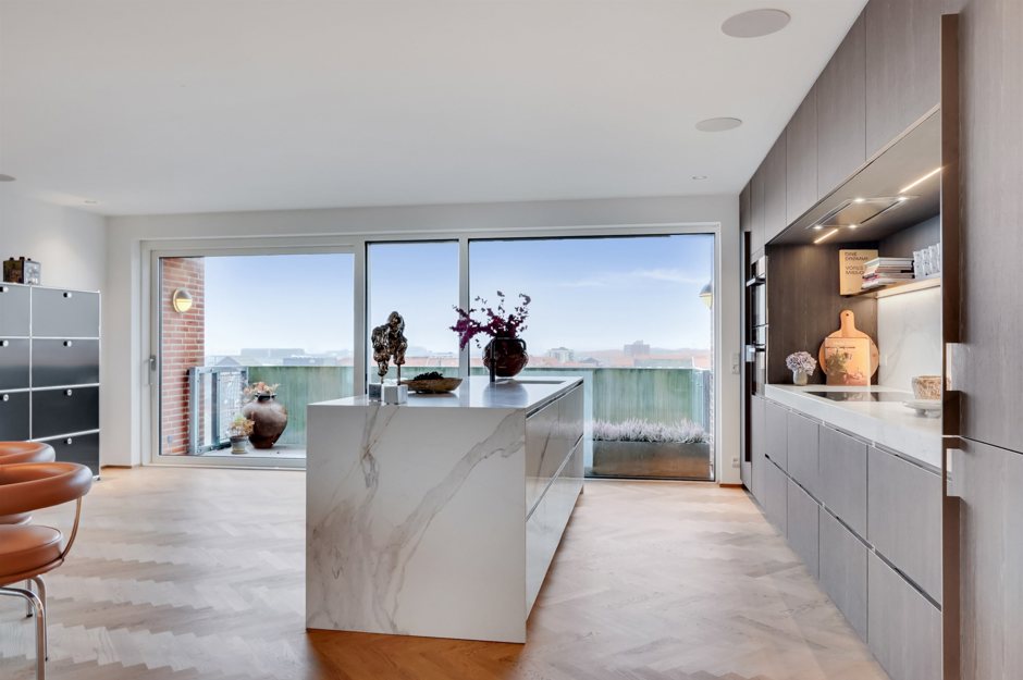 Det store køkken/alrum i åbent miljø er ideelt til både hverdagsliv og festlige sammenkomster, med direkte adgang til de to solrige altaner.