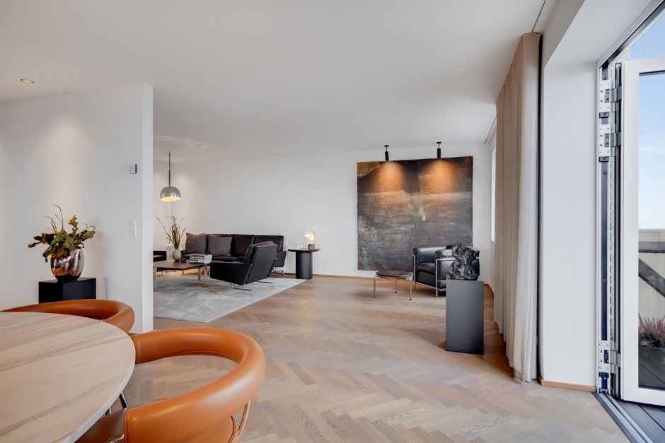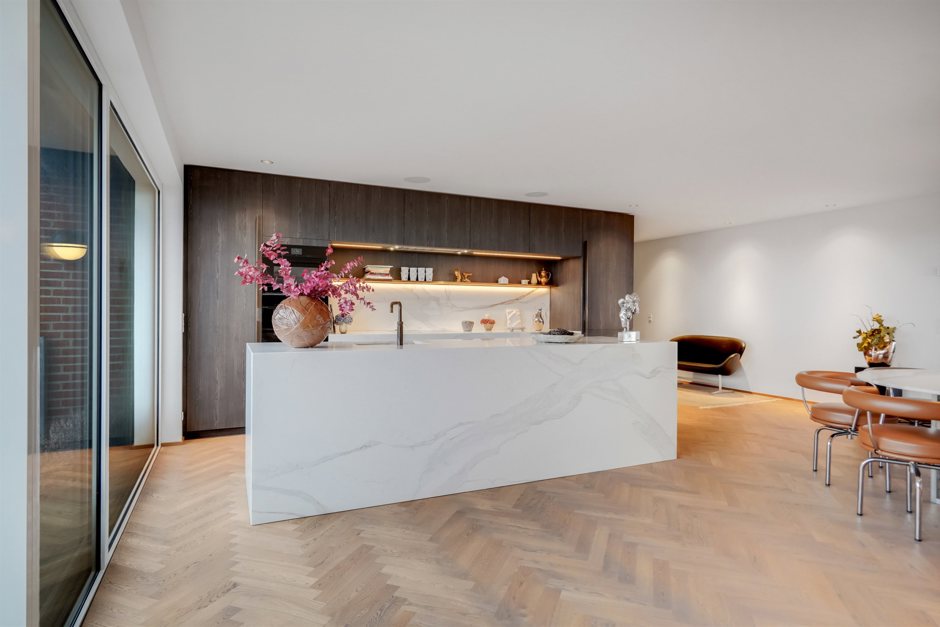 Denne velindrettede ejerlejlighed byder på en uovertruffen standard, hvor hver detalje er nøje overvejet. De imponerende store vinduespartier skaber en lys og indbydende atmosfære, mens de eksklusive gulve tilfører varme og elegance. Med to gode altaner kan du nyde den friske luft og den betagende udsigt over byens skyline.