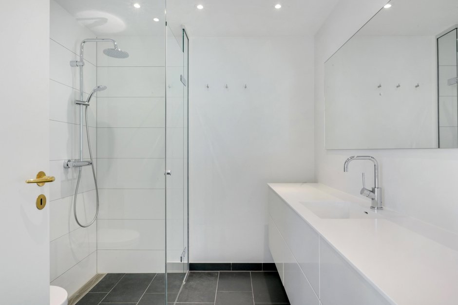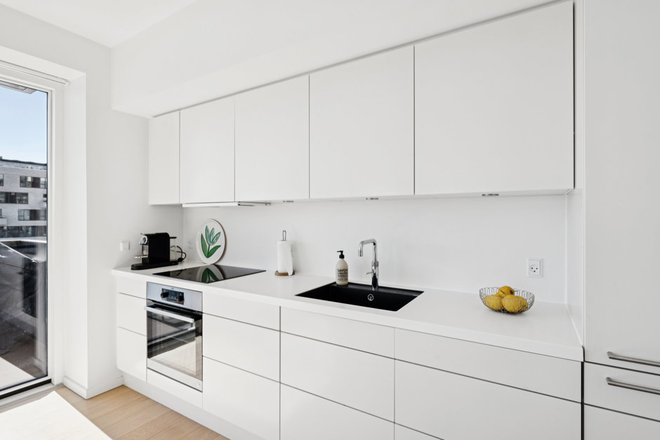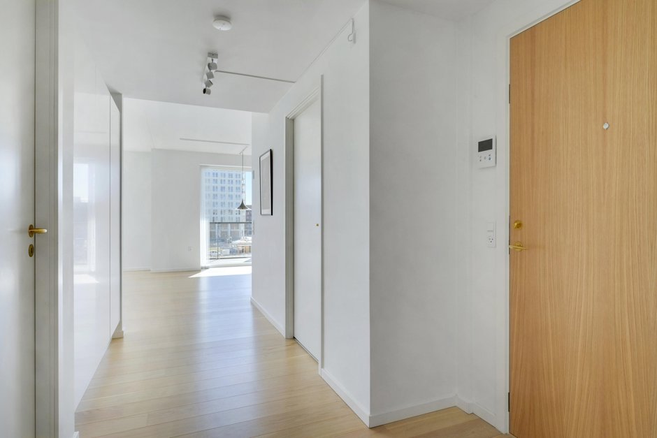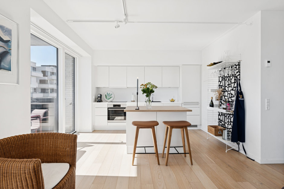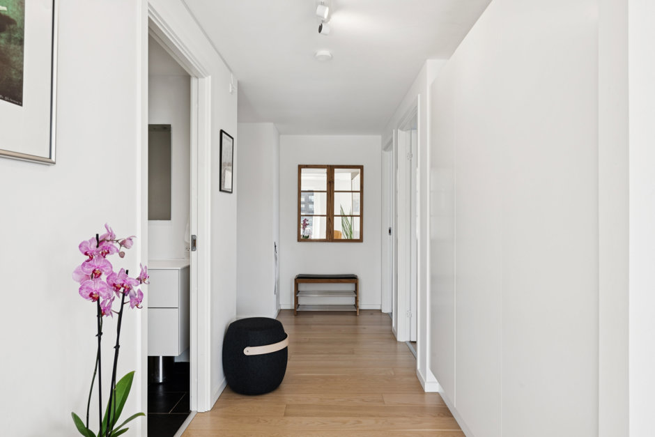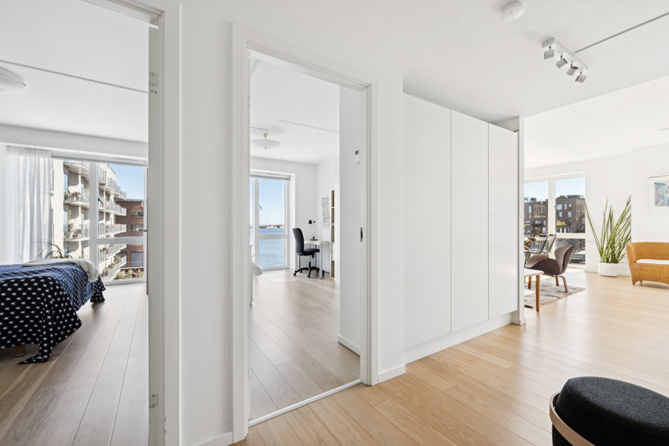 Slå døren op til 105 kvm, der tager deres begyndelse i et bredt entré- og gangareal med store, indbyggede skabe og smukke, lyse egetræsgulve, som fortsætter gennem de øvrige værelser. På venstre hånd åbner to store værelser til et indbydende og indretningsvenligt miljø, mens I på højre hånd kan tilgå det lækre badeværelse, der er udstyret med Corian håndvask og bordplade, separat bruseniche og integreret vaskesøjle. Afslutningsvis bevæger I jer ind i det skønne køkken-alrum, der smelter sammen med stuen; et stilrent lokale med lyse køkkenelementer, Corian køkkenbordplade, Quooker samt en køkken ø / arbejds ø hvor du kan står og lave middage med udsigt til Øresund..