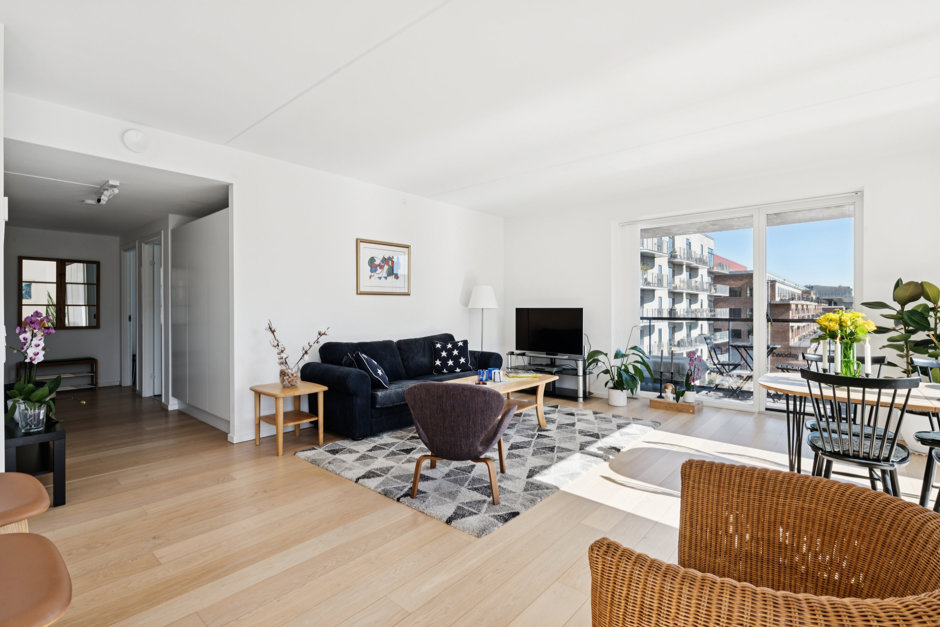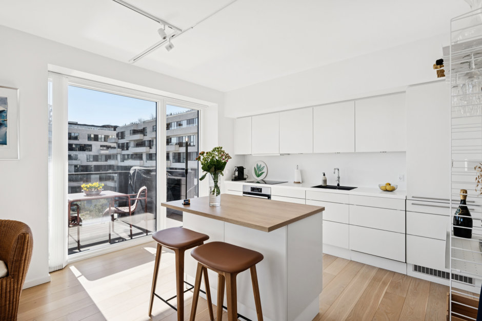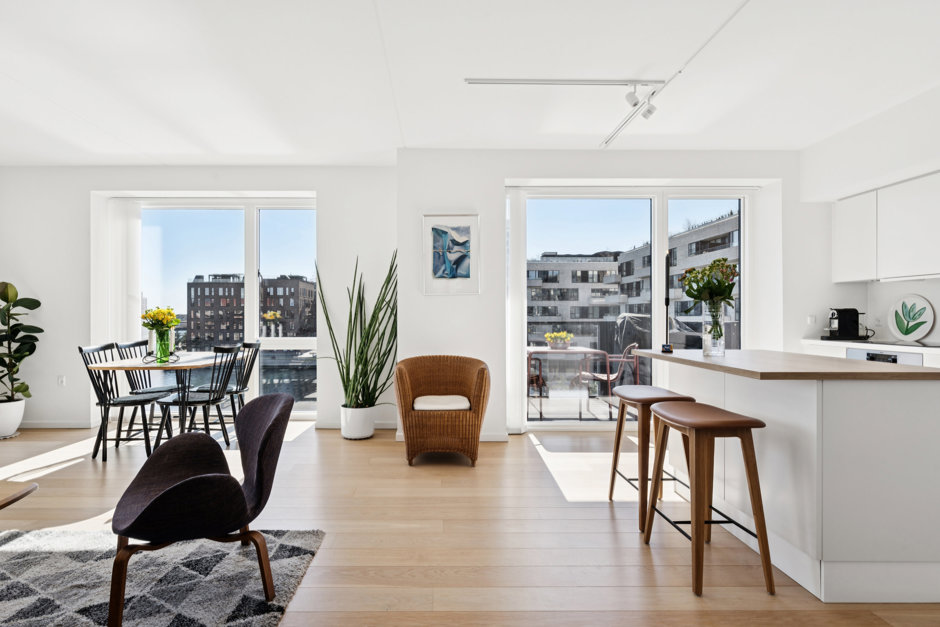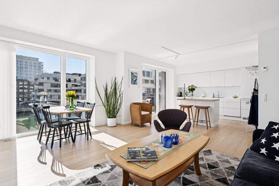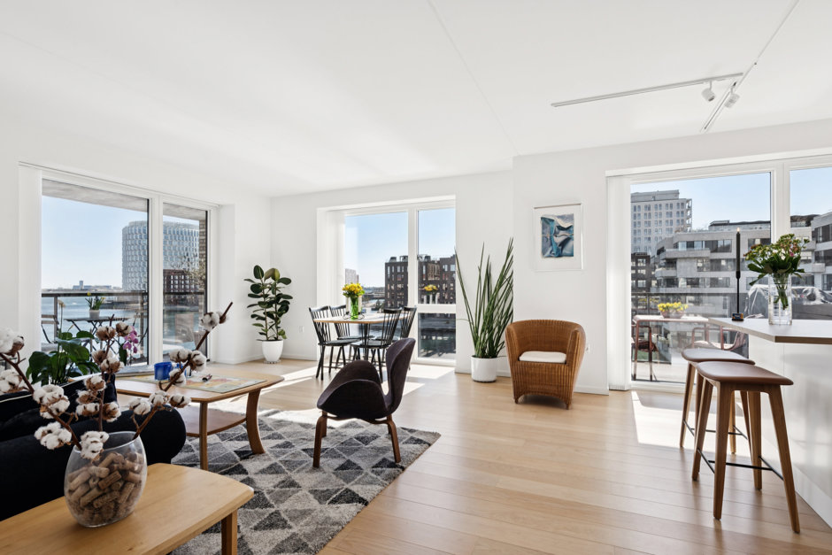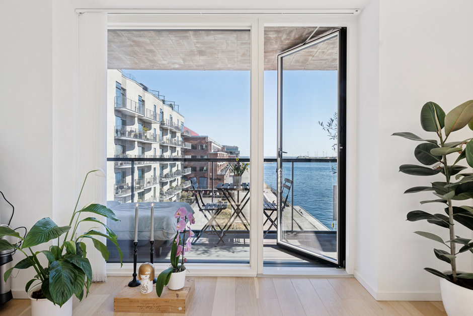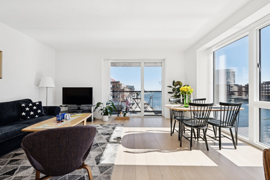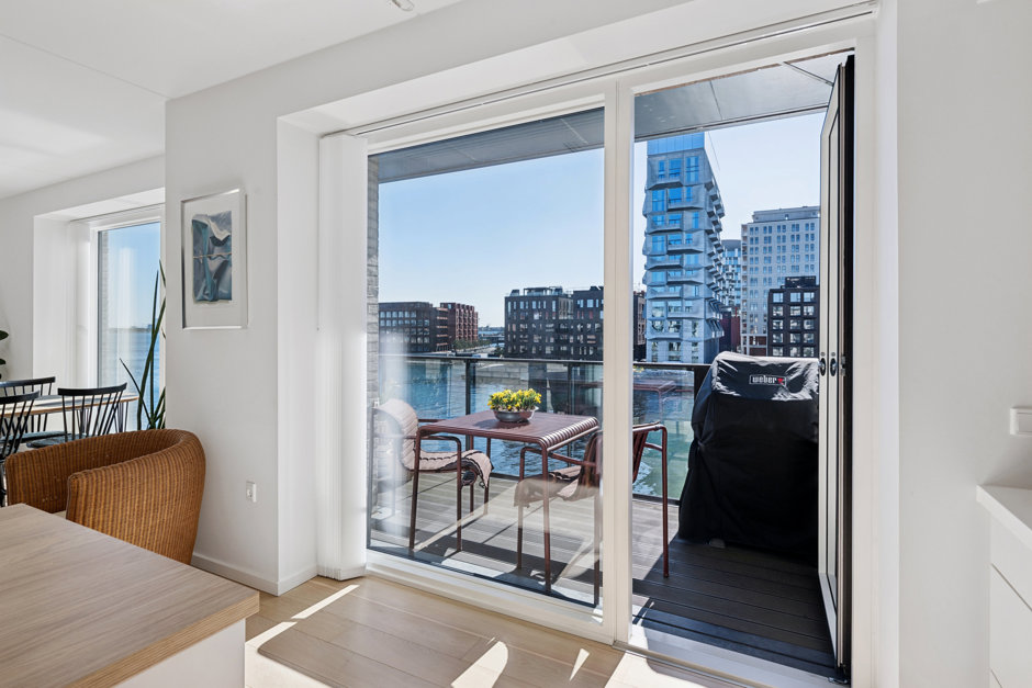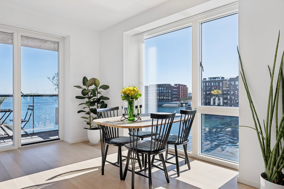Med de store vinduespartier fra gulv til loft føles rummet endnu større og lysere, hvilket fuldendes med en fantastisk udsigt over vandet. De syd- og østvendte facader ud mod vandet uden tætte naboer lader jer se solopgang og solnedgang samt nyde fuldt lysindfald dagen lang. Det sublime view over Øresund kan nydes fra alle værelser, men er flottest fra de to store altaner, hvor der bl.a. er udsigt til Øresundsbroen, Turning Torso og Trekroner.