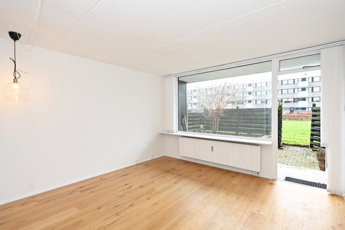 Den skønne, lyse stue er fyldig og indretningsvenlig og har udgang til både terrasse og have samt egen låge til de store, grønne fællesarealer.