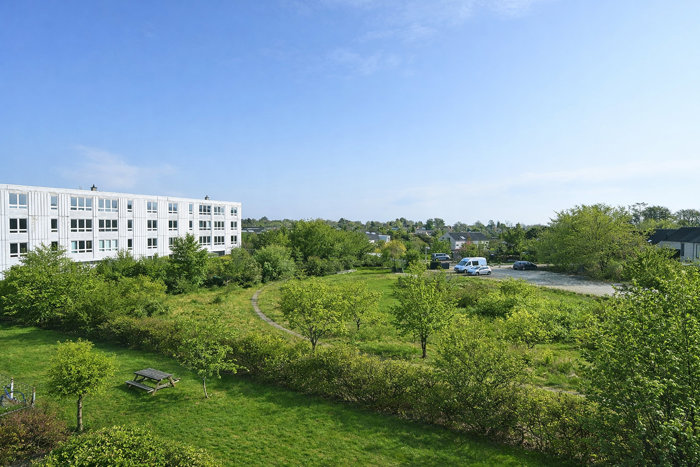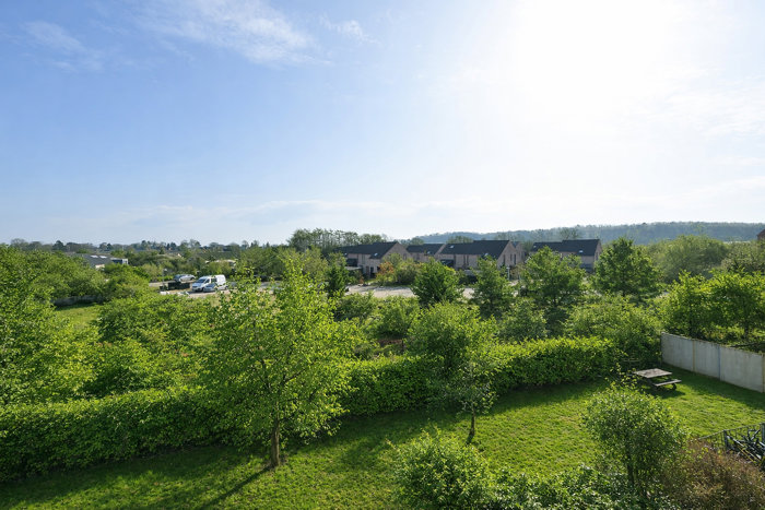 Lejligheden er placeret i bebyggelsens sidste blok, hvilket giver en helt særlig ro og privathed. Her er du trukket væk fra vej og trafik og kan i stedet nyde en ugeneret, fri udsigt over grønne områder fra de store vinduespartier, der lukker lyset smukt ind i boligen.
