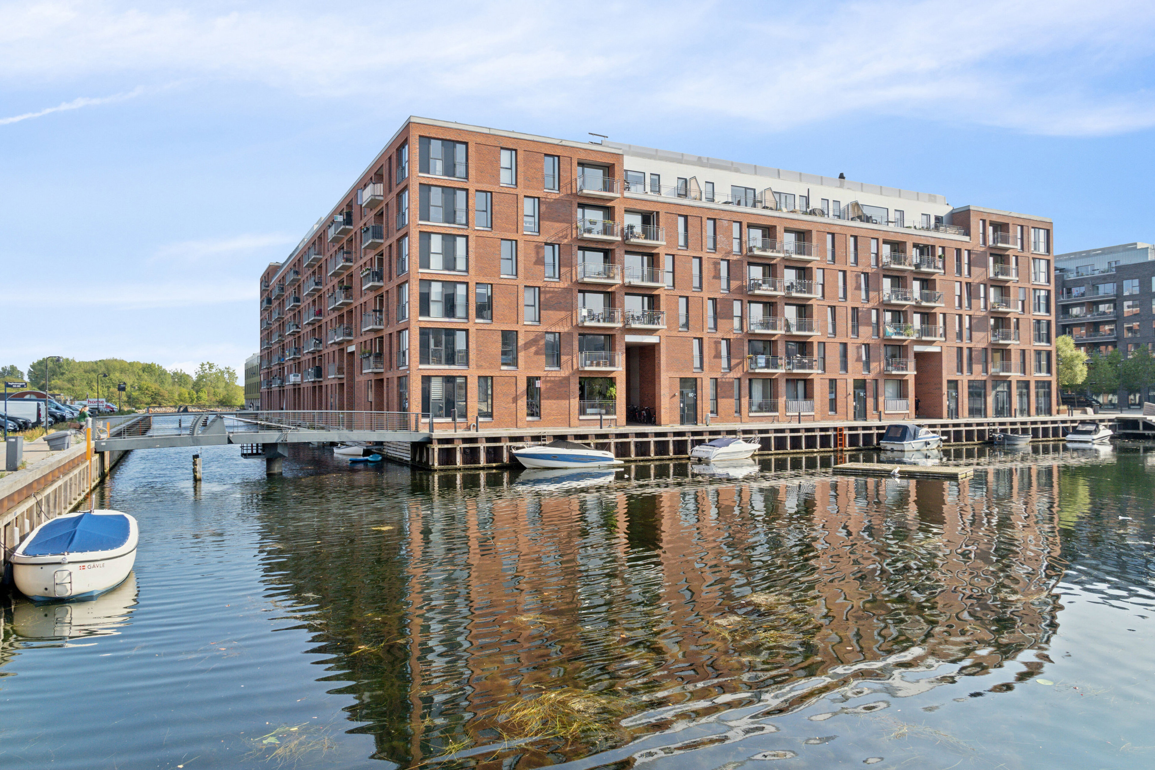 Lejligheden er en høj stuelejlighed i en veldrevet ejendom fra 2014 – placeret lige ud til vandet. Den åbne placering giver et særligt lysindfald, og da der på modsatte side ligger en skole, har I ingen tætte naboer direkte overfor.