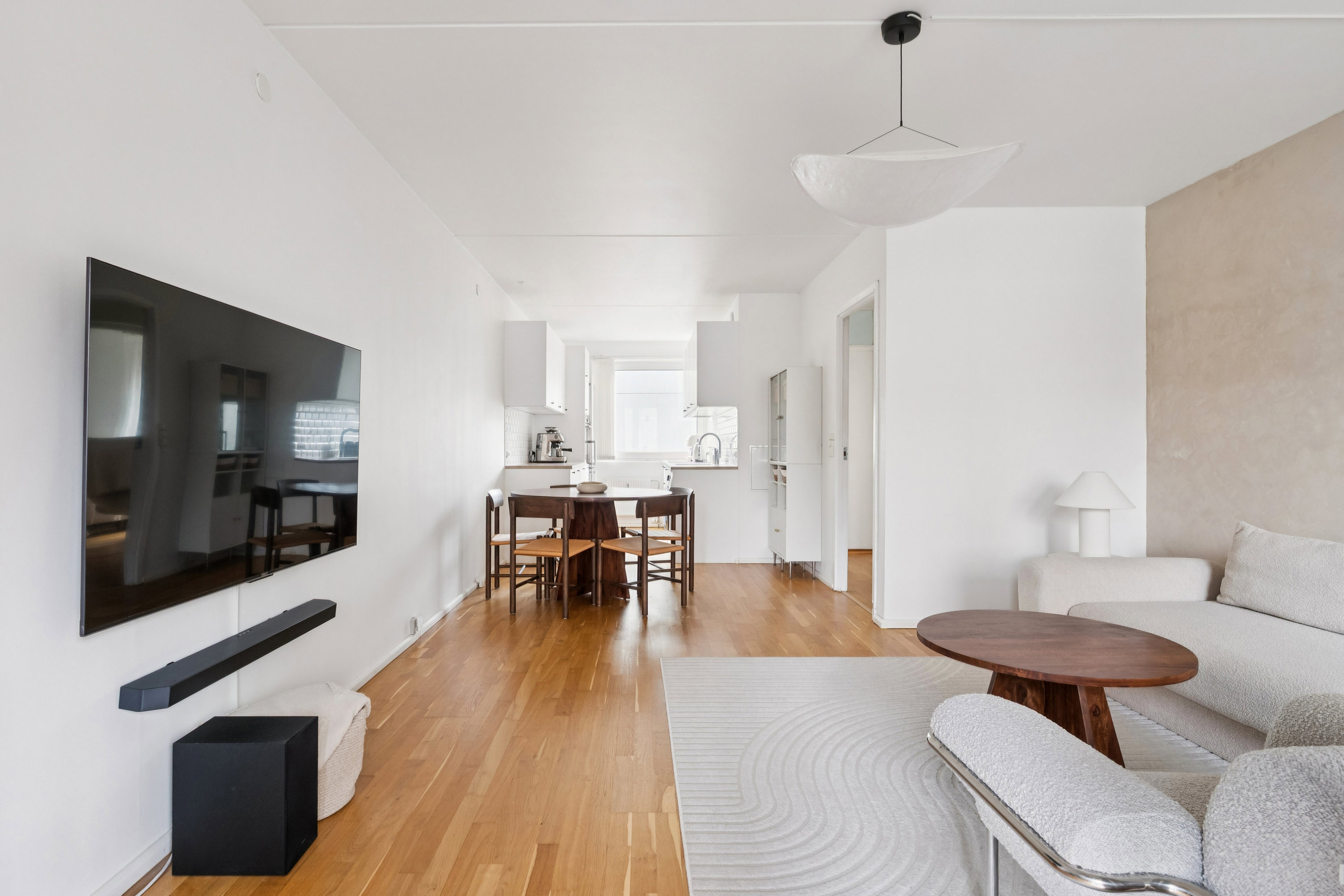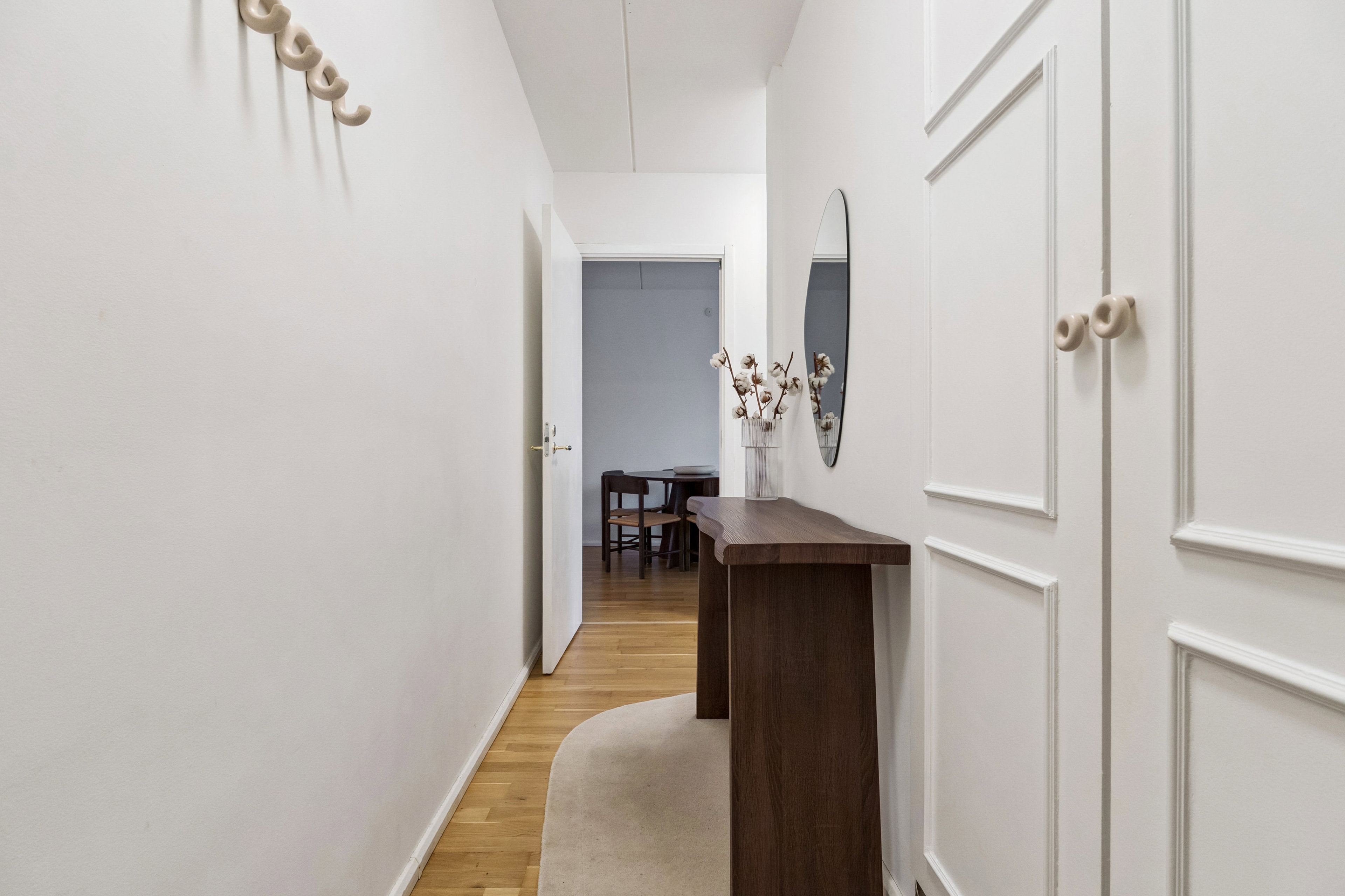 Den rummelige entré byder velkommen og er velforsynet med skabe til overtøjet. Det store rummelige soveværelse er ligeledes velforsynet med store skabe og et godt lysindfald. Hvidt Køkken fra 2020 står som nyt - lyst og indbydende med bla. opvaske- & vaskemaskine og med plads til spisebordet. Køkkenet ligger i halvåben forbindelse med den store stue, så man har et skønt gennemlyst rum, der åbner sig op til den 8 kvm. store altan. Badeværelset er rummeligt med god bruseplads og vindue til at lufte ud.