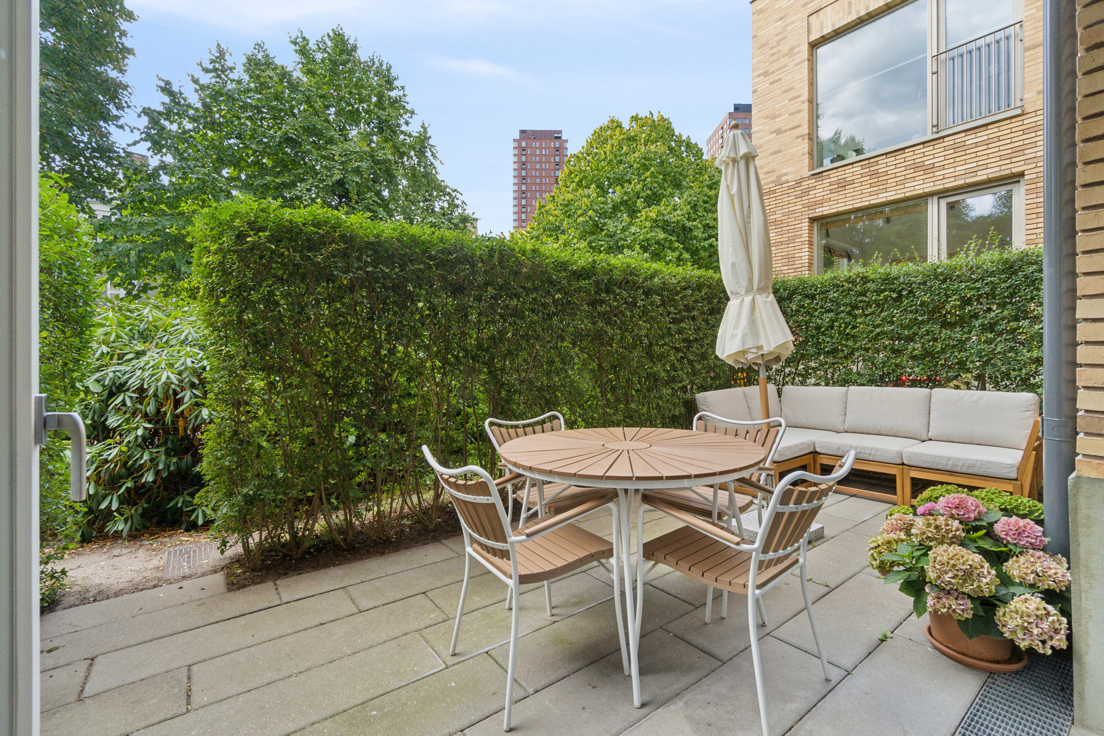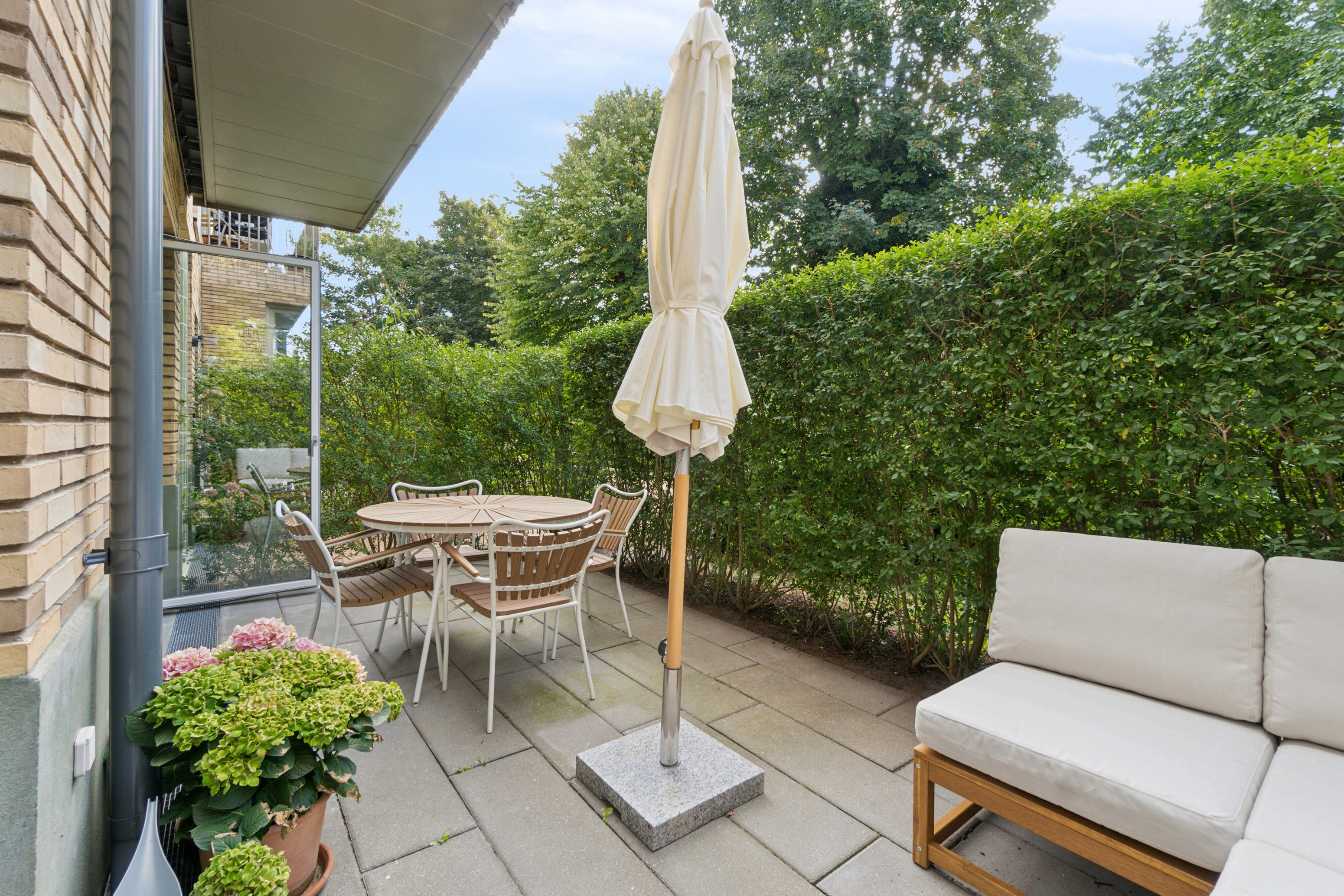 Sydvendt terrasse med grønt kig og Humleby i baggrunden, attraktiv beliggenhed og et privatliv i