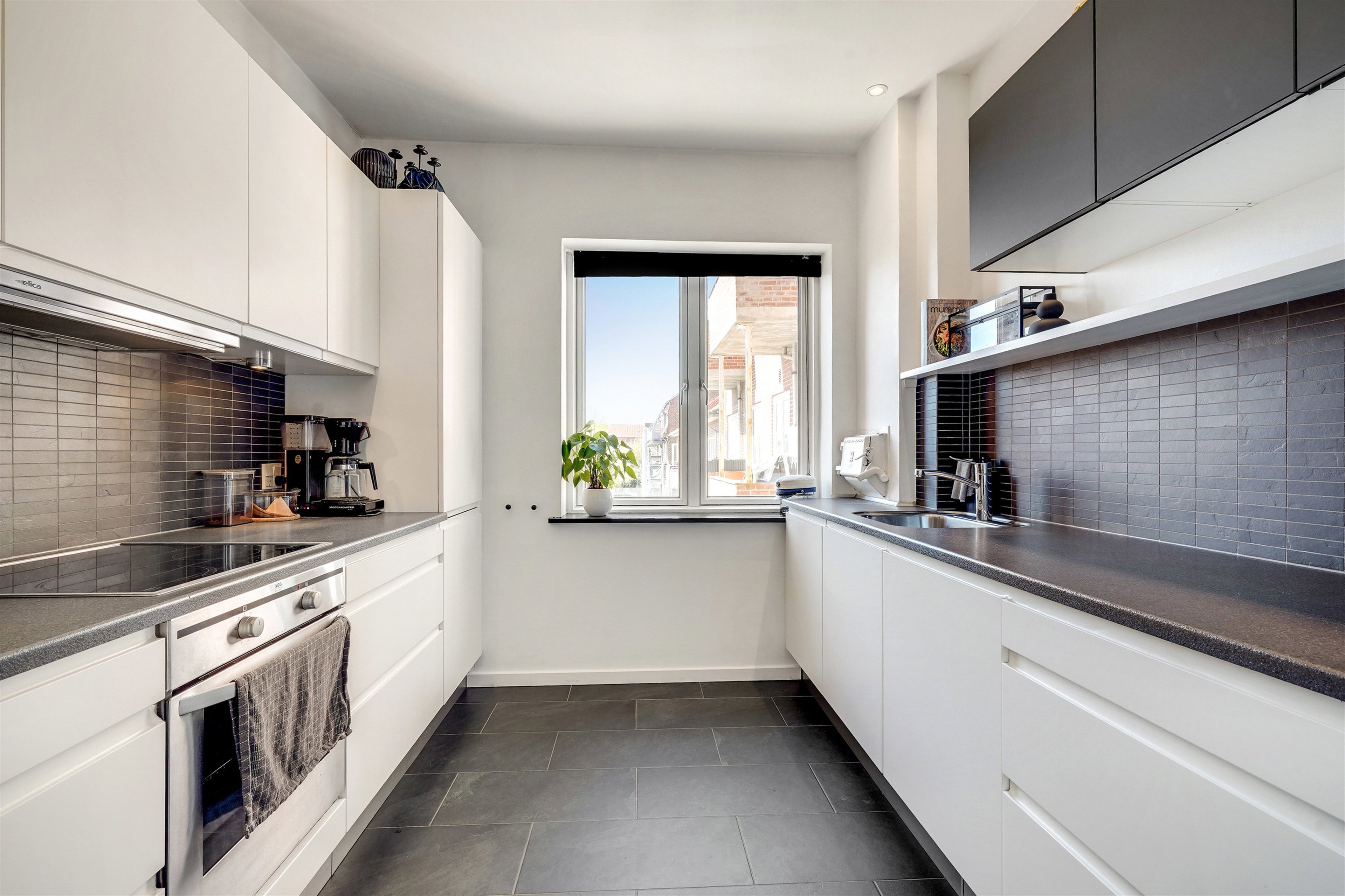 Lejligheden byder på en rummelig entré med god plads til jakker og sko – perfekt til en travl hverdag. Køkkenet er et stilrent moderne HTH-køkken med gode hvidevarer, inkl. opvaskemaskine og vaskemaskine, så hverdagen glider lidt lettere.