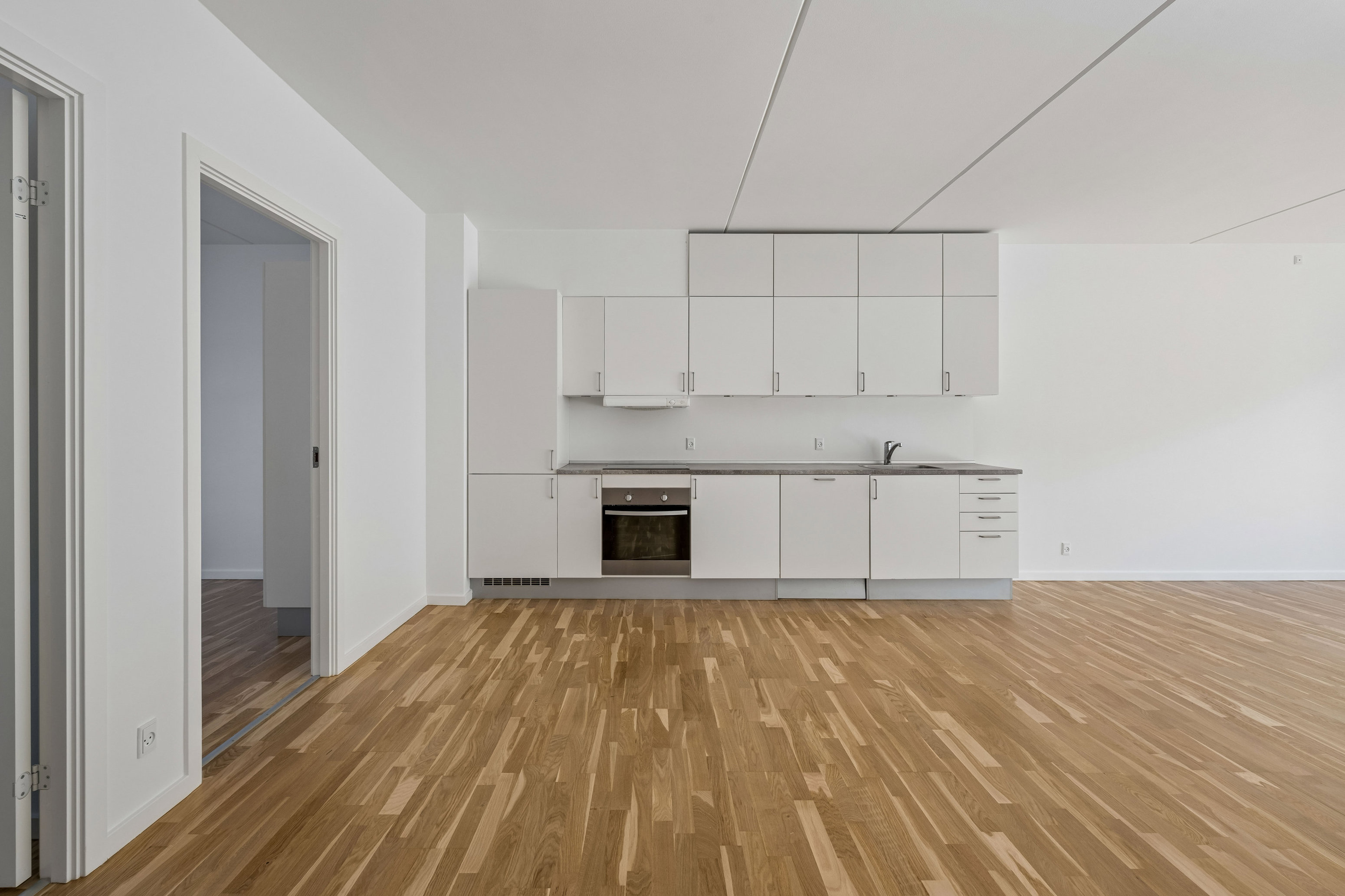 Fra leverummet er der adgang til de 3 værelser der alle er forsynet med skabe. Badeværelset er holdt i lyse vægfliser med stor bruseniche elegant afskærmet af glasvæg, vask med underskab, væghængt toilet, installation og plads til vaskesøjle samt gulvvarme. Sommeren kan ligeledes nydes fra den store fælles tagterrasse.