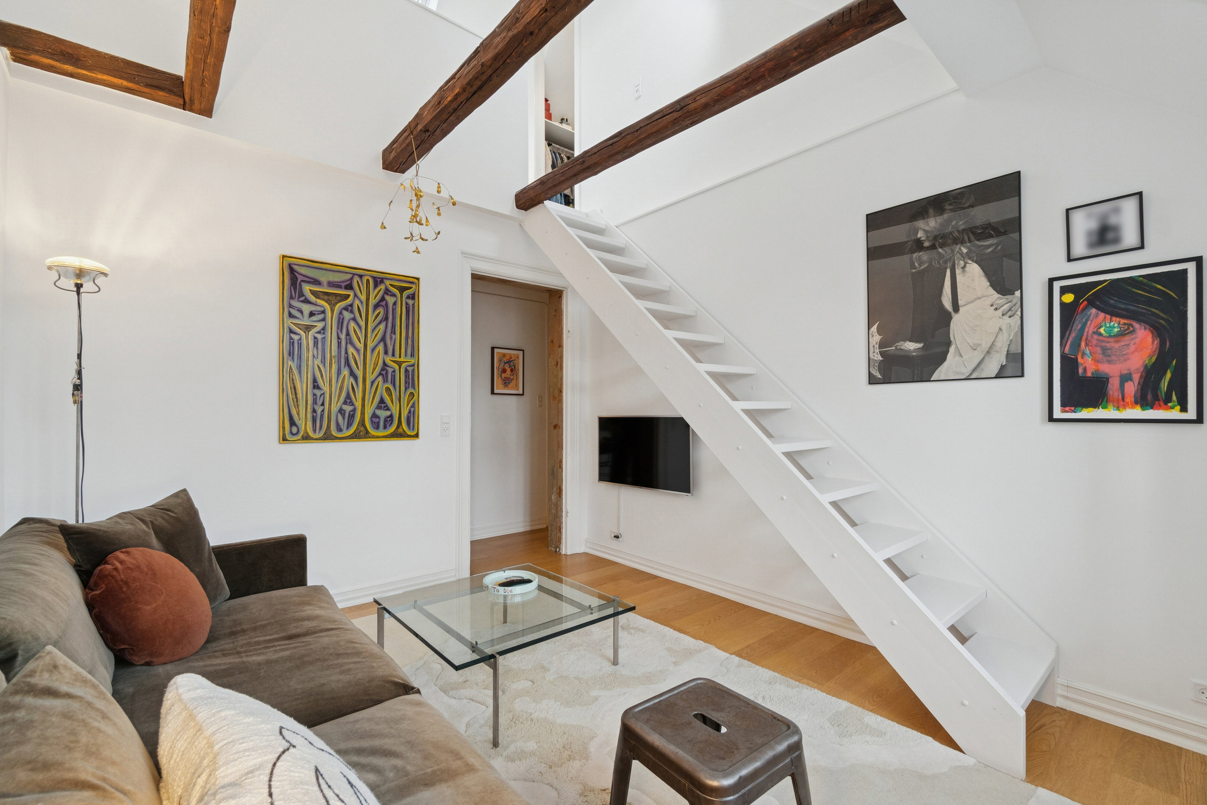 Den hyggelige stue imponerer med loft til kip, flot lysindfald og et åbent, luftigt udtryk. Hertil får du et ekstra rum, som elegant er indrettet som en eksklusiv hems med et lille snedkerlavet walk in closet og Velux-tagaltan. Ideelt som ekstra soveværelse, opholdsrum eller kontor. Badeværelset er rummeligt og velindrettet med separat bruseniche samt gode skabs og opbevaringsløsninger.