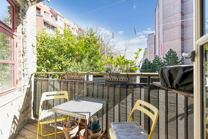Du får hjemme i en klassisk rødstensejendom fra 1932, og bag gadedøren putter din kommende lejlighed sig i et højt stueplan. Det betyder naturligvis, at selve lejligheden er let tilgængelig, men stadig skærmet fra nysgerrige blikke fra forbipasserende. En altan forlænger boligens allerede gode kvaliteter ud i det fri med plads til kaffe, krydderurter og solrige sommerdage. Og parkering? Cyklerne står under overdække bag ejendommen, mens bilen kan få plads foran.
