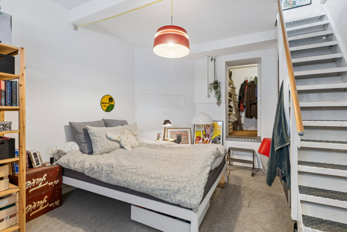 Entréen fordeler det hele uden spild: et badeværelse, et værelse og et køkken, der ikke bare er til at lave mad i, men også til at blive hængende i. Her er nemlig plads til en lille spisekrog, så dagene kan starte stille og roligt herude. Etagen råder ydermere over en stor, lys stue, hvor såvel sofaen som spisebordet nemt kan få plads. Herfra fører trappen ned til et disponibelt rum, der foruden opbevaring også kan indrettes som et hjemmekontor eller et kreativt frirum, og dertil kommer et gangareal, der tager sig af alt det praktiske. Der er desuden egen indgang fra gården til kælderetagen.