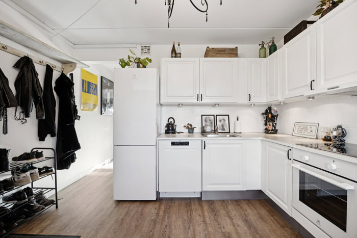 Man træder ind i et stort og åbent køkken. Her er der god bordplads, fine opbevaringsmuligheder og plads til et lille spiseområde – et rart sted at starte og slutte dagen.