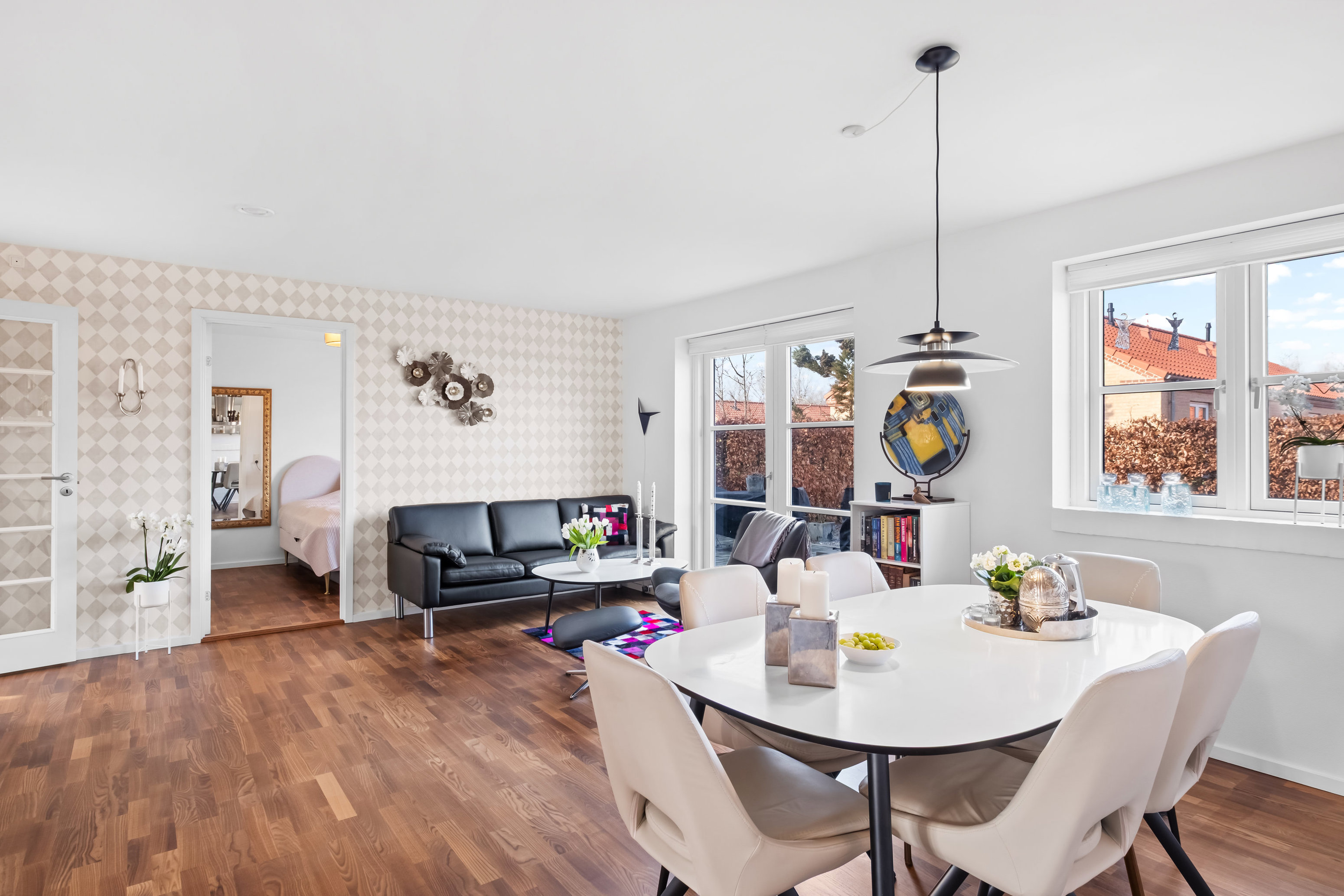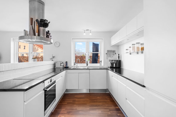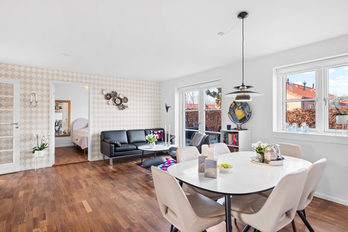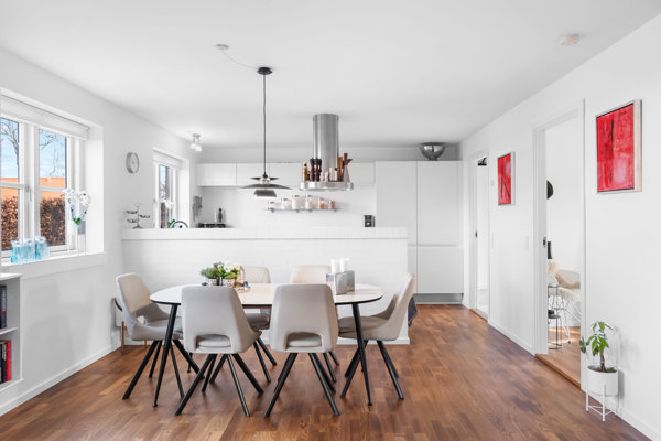 Indendørs fremstår boligen moderne og indbydende. Køkkenet er opgraderet til et flot, hvidt grebsfrit HTH-køkken med eksklusiv sort granitbordplade og god skabs- og bordplads. Køkkenet ligger i åben forbindelse med opholdsrummet, hvilket skaber et lyst og sammenhængende opholdsmiljø med god plads til både spisebord og sofaområde.