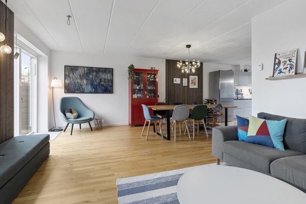Det store, lyse køkken-alrum og stue i ét er husets hjerte. Her er plads til både lektier ved spisebordet, madlavning med gæster og rolige aftener i sofaen – alt sammen med et skønt lysindfald og direkte udgang til den solrige terrasse mod syd. Nydelig entre samt et stilrent badeværelse med bruseniche.