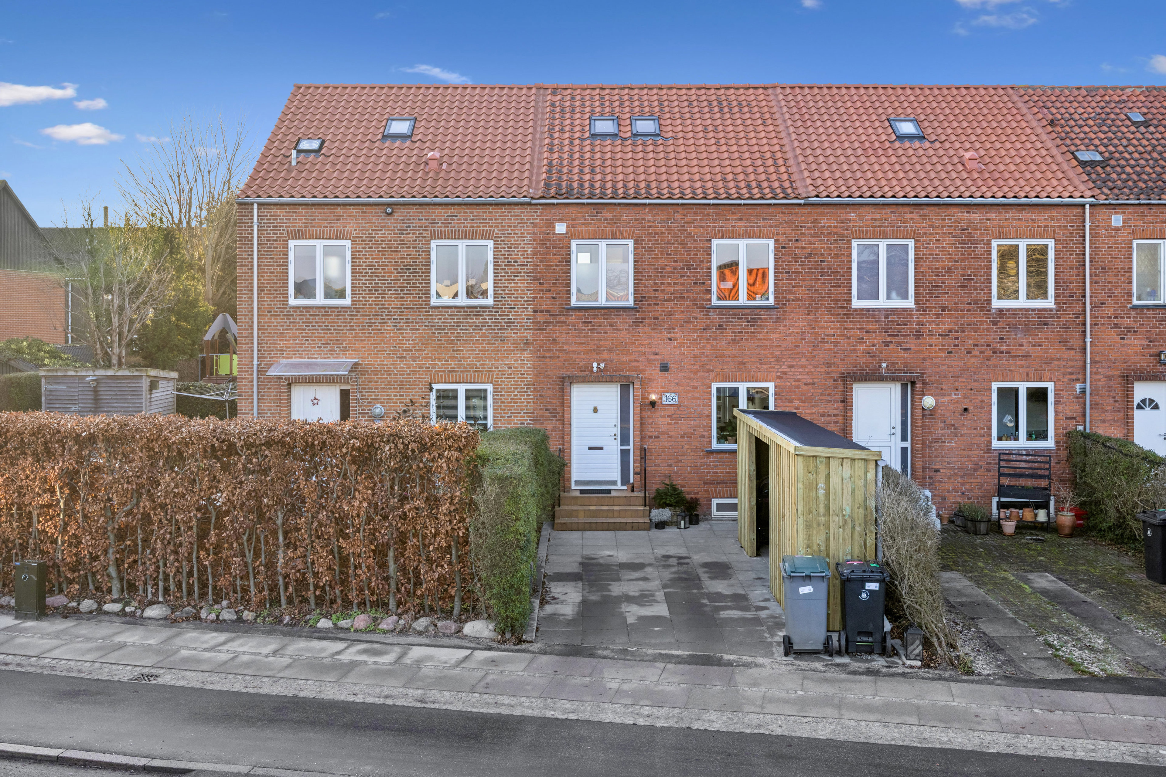 Mod vest forlænges opholdsrummet af en terrasse og have, der er lukket til alle sider, så I kan nyde udelivet i en dejligt privat atmosfære. Dette er altså lige noget for jer, der drømmer om hus og have uden det store vedligehold. Derudover passerer I på vej op til hoveddøren et praktisk skur, og til stor glæde for familiens mindste er der en fælles legeplads på grundejerforeningens fællesarealer, som er aflåst for udefrakommende.