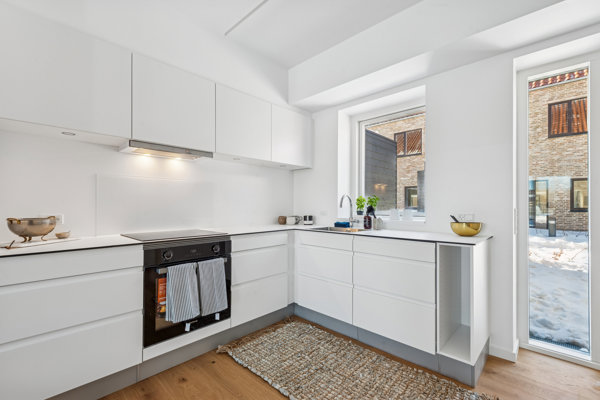 Boligerne byder på en gennemtænkt planløsning med en naturlig opdeling mellem opholdsrum og værelser. I stueplan træder I ind i entréen med adgang til badeværelse og bryggers. Herfra åbner boligen sig op i et lyst og sammenhængende køkken- og stueområde, hvor køkkenet er placeret i åben forbindelse med opholdsrummet. Indretningen giver god plads til både spisebord og sofaafdeling, og fra stuen er der direkte udgang til terrasse.