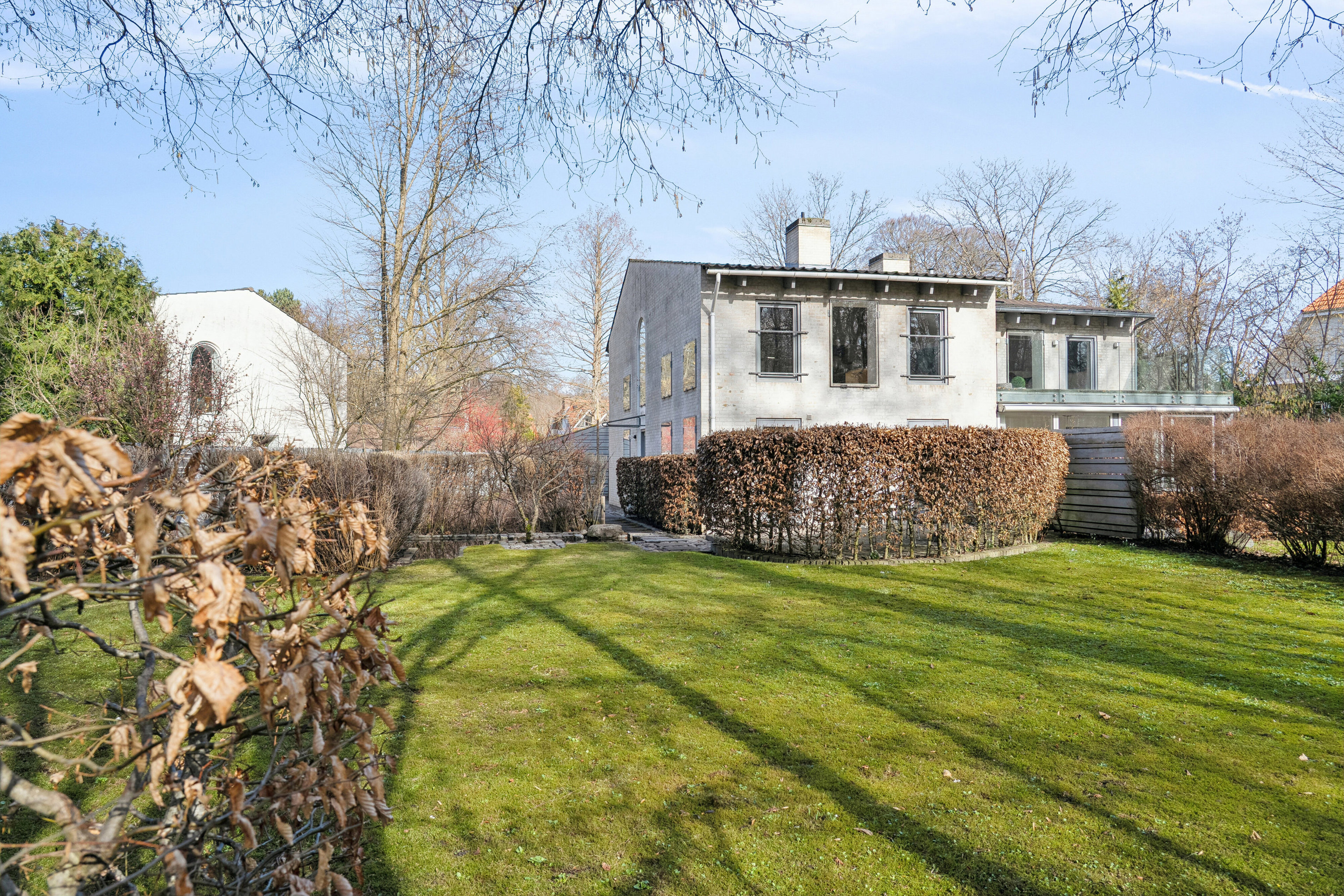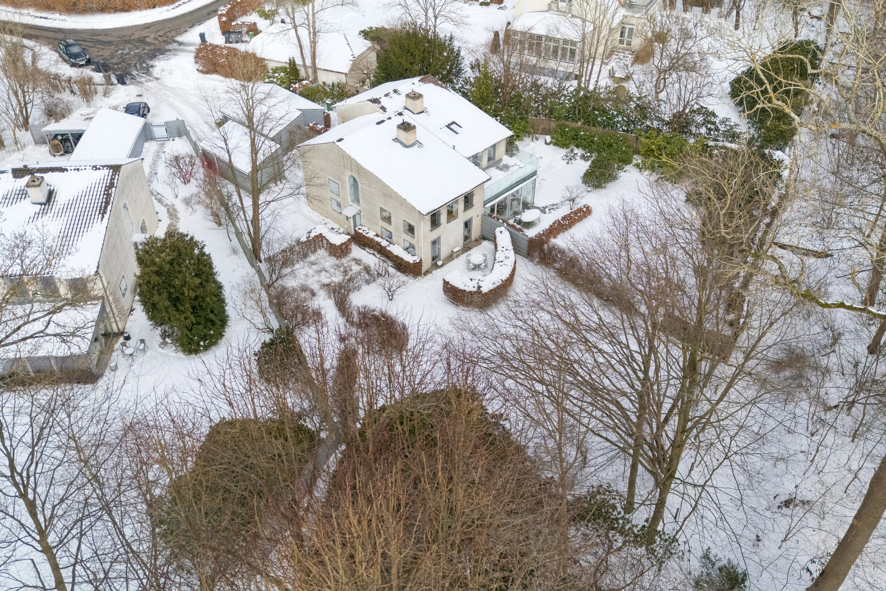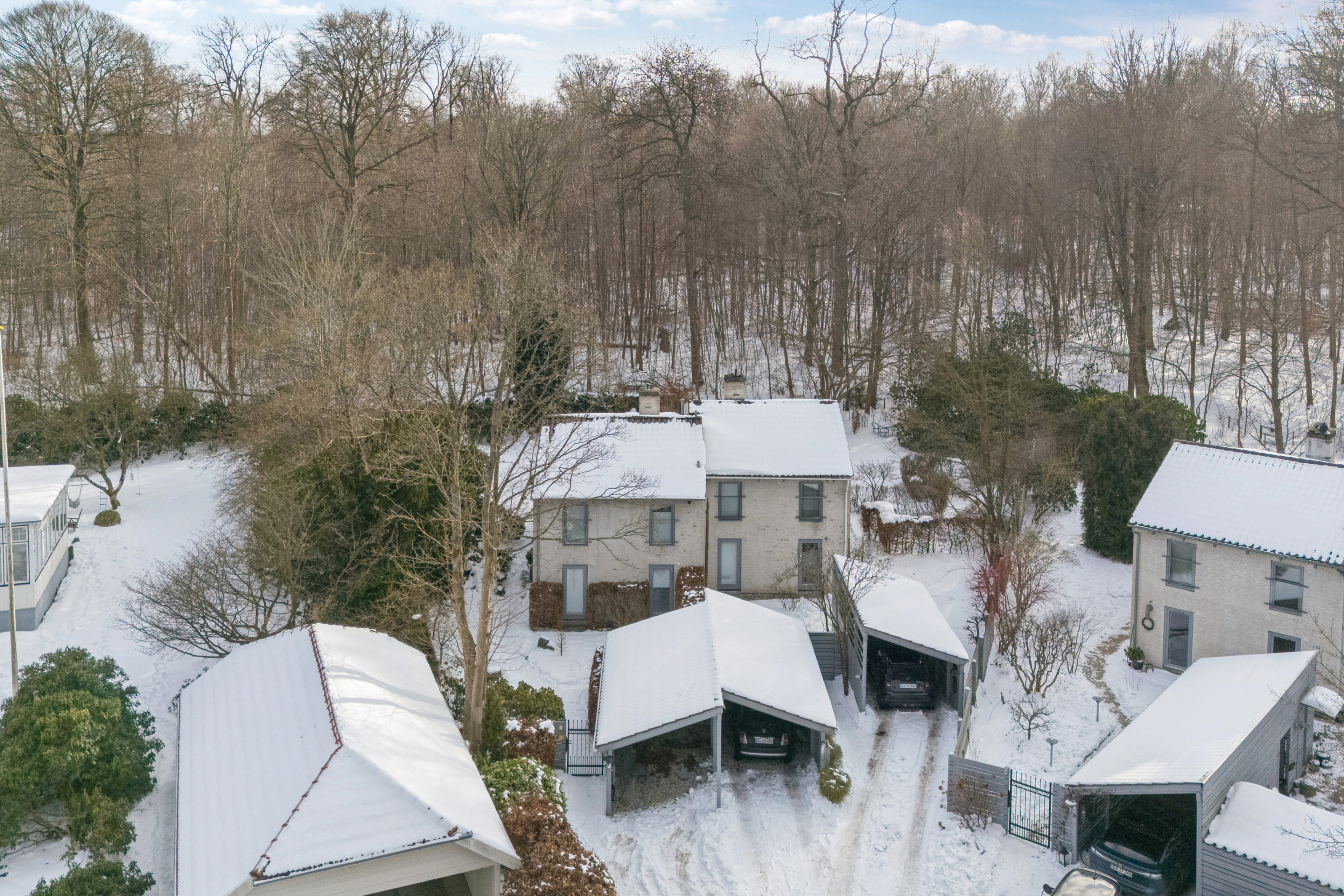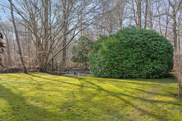 Den sydvestvendte terrasse er omkranset af en bøgehæk, der giver læ og privatliv, mens den flotte have, som går helt op til skoven og har egen låge dertil, er anlagt med små bede og hyggelige kroge. Og så er selv de to carporte (den ene med ladestander til elbil) arkitekttegnet i stil med det halve dobbelthus.