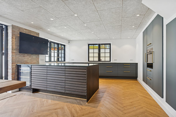 Videre træder du ind i det imponerende køkken, hvor den grønne bordplade er med til at løfte boligens udtryk – næsten som et kunstværk i sig selv, der tilfører rummet både karakter og eksklusivitet.