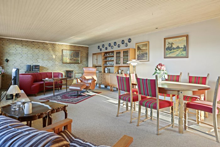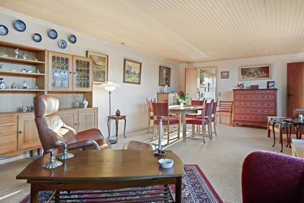 Man bydes velkommen i en praktisk entré, som fører videre ind i fordelingsgangen. Herfra har man adgang til boligens store stue. Her strømmer lyset ind gennem de brede vinduespartier, og rummet har en rolig atmosfære og en flot udsigt til haven. Stuen har en ideel størrelse til både spisebord og sofamiljø, og den fungerer som boligens naturlige samlingspunkt, hvor familien kan samles om både hverdagsliv og hyggestunder.