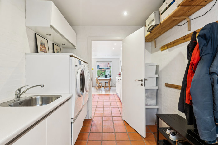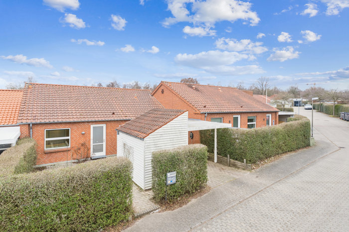 Derudover rummer boligen et rummeligt, lyst badeværelse med bruseniche samt både gæsteentré og praktisk bryggers med vaskefaciliteter og ekstra opbevaring. Fra stuen er der direkte udgang til den flisebelagte terrasse og den hyggelige have, mens ejendommen på modsatte side byder på carport, isoleret skur og endnu en terrasse – perfekt til morgenkaffen i solen.
