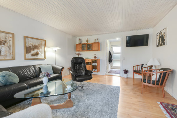Den tilhørende grund er ydermere på 270 m2, så det passer lige præcis med, at I kan få udeområder på begge sider af huset. Mod vejen er fliseterrassen afskærmet af en høj hæk, og bag huset får I en stor, overdækket fliseterrasse. Lidt plæne, buske og bede skal I naturligvis heller ikke snydes for, og den vestvendte orientering er en fin sidegevinst.