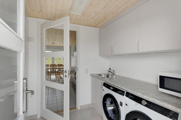 Den tidssvarende planløsning er en endnu større gevinst ved moderne boliger, for de 107 m2 er decideret renset for spildplads. I får fuld udnyttelse af samtlige rum – også af entréen, hvor pladsen under trappen kan bruges til vinkøleskab, kummefryser eller helt almindelig opbevaring. Tilsvarende er bryggerset veldisponeret med gode skabe og plads til vaskefaciliteter, og dermed er flest mulige kvadratmeter tildelt boligens faktiske kernerum.