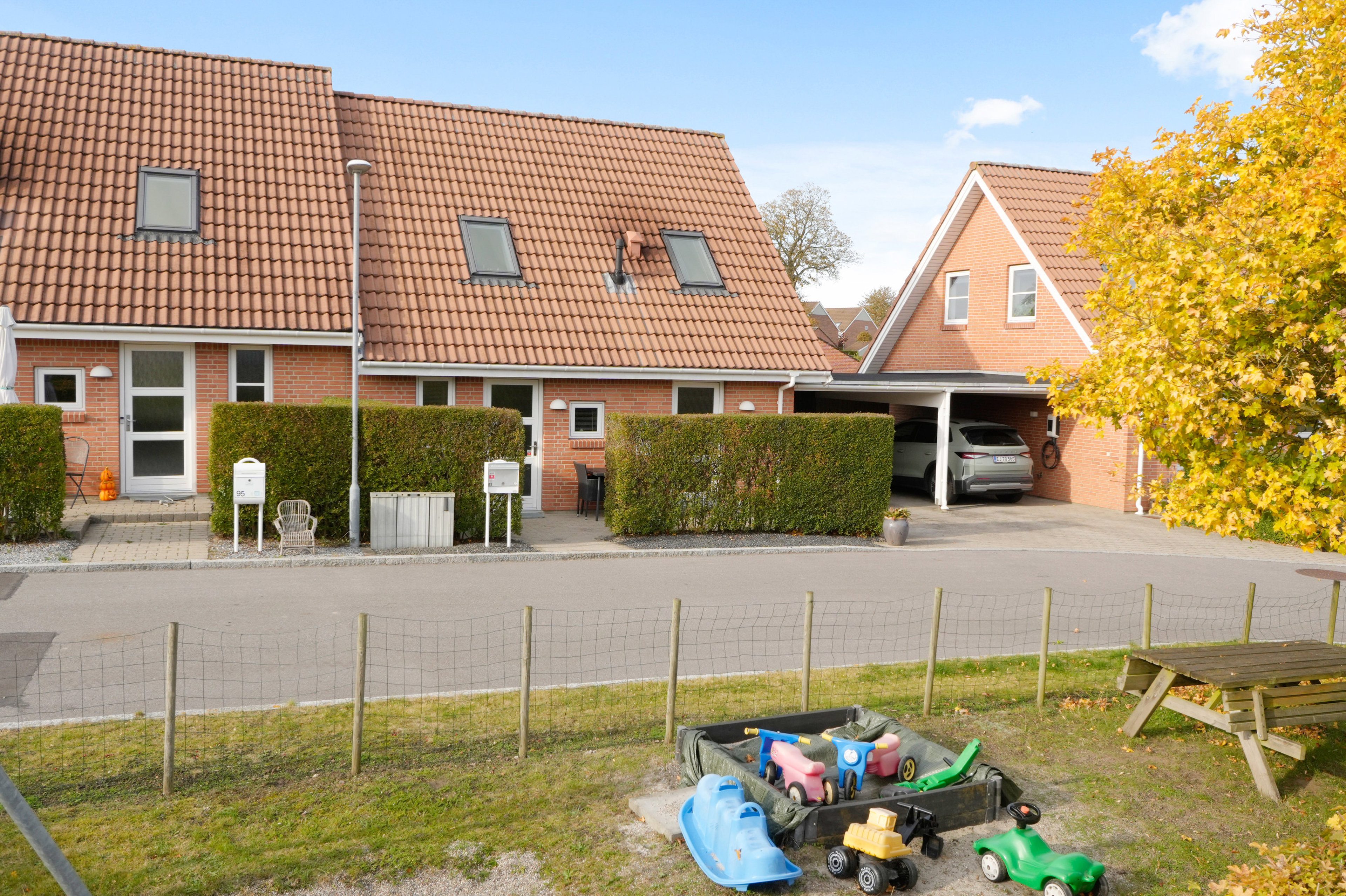 Måske er alder bare et tal, men det samme kan ikke siges om et byggeår. Ejendommen fra 2004 har nemlig nogle medfødte evner, som bestemt ikke er alle tilsvarende boliger forundt. Den første gevinst er helt tydelig, for I får et hus, som ikke bare er funktionelt, men også nydeligt i sit udtryk. Facader i rødsten komplementeres af hvide vinduesrammer og døre, mens der allerede er trukket strøm i den 24 m2 store, integrerede carport. Elbiler er med andre ord mere end velkomne her.